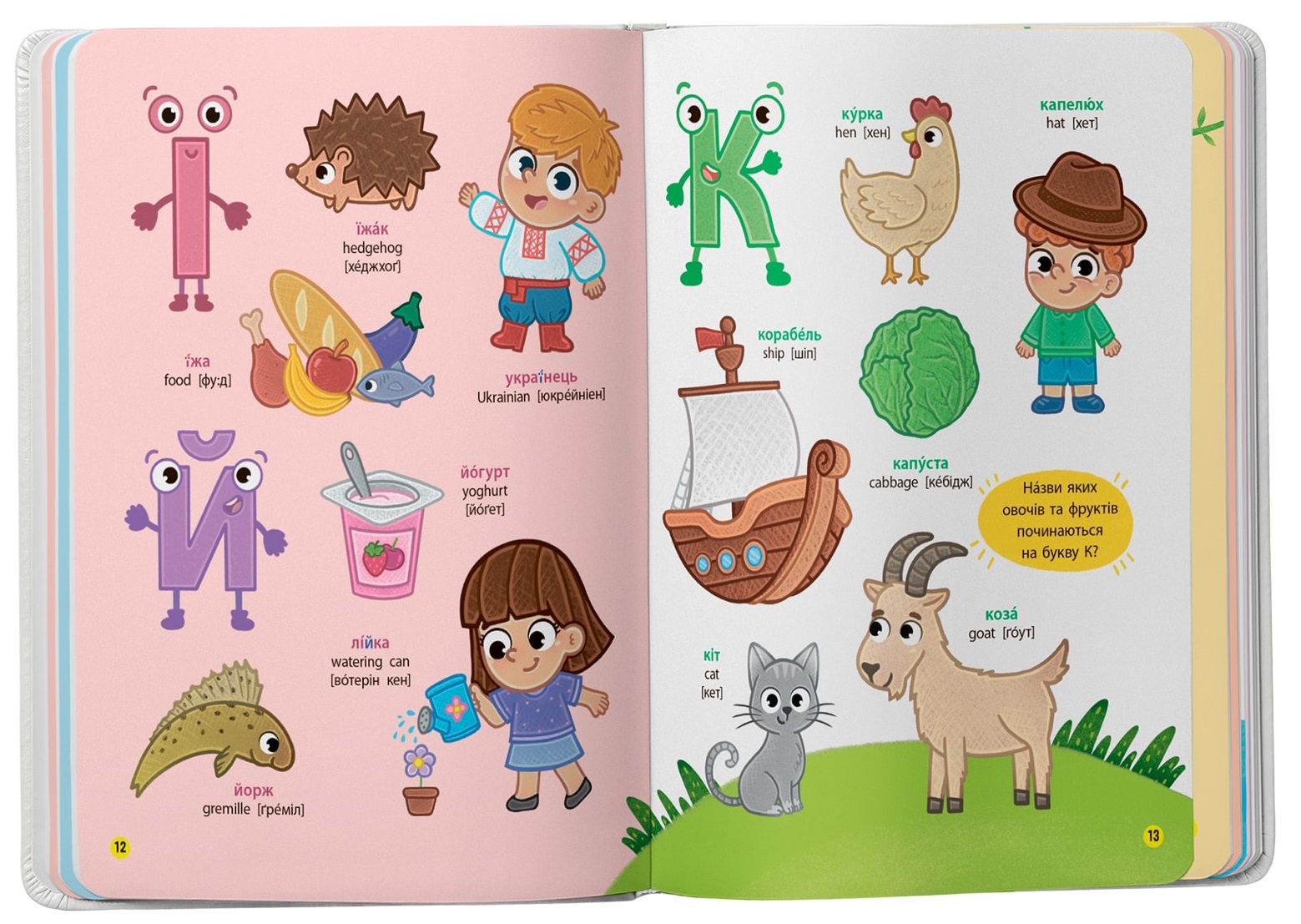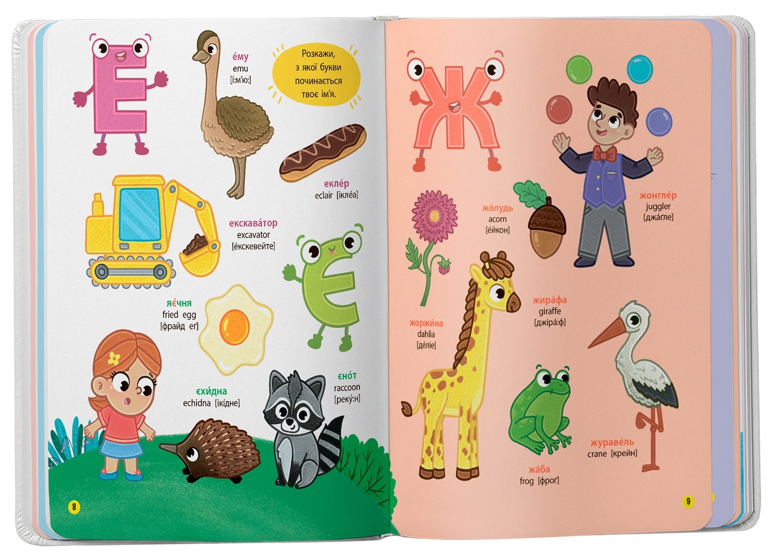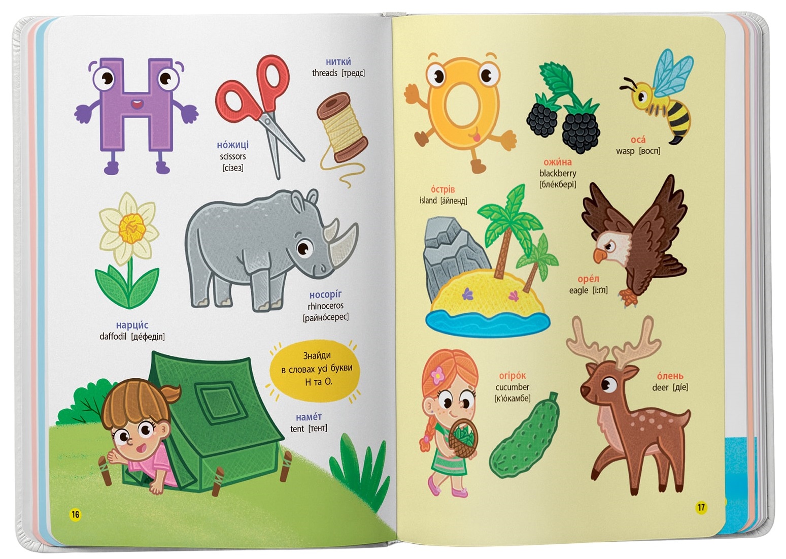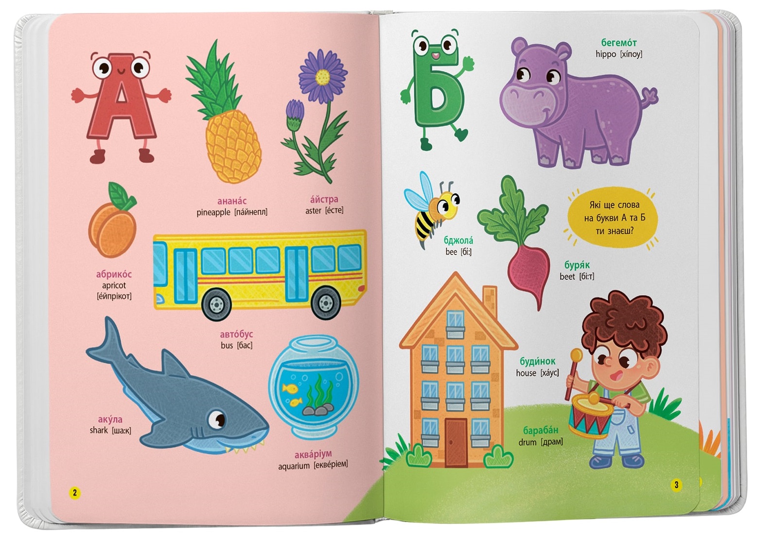 Ця книжка допоможе дитині в ігровій формі вивчити абетку та засвоїти нові слова, навчитися чітко та правильно їх вимовляти, а також сприятиме розвитку логічного мислення та вивченню навколишнього світу. На кожному розвороті малюк бачитиме великі кольорові малюнки, запам’ятовуватиме нові слова, відшукуватиме задані предмети, відповідатиме на запитання. Підписи в книжці подано двома мовами, що зробить вивчення англійської легким і веселим навіть для найменших.