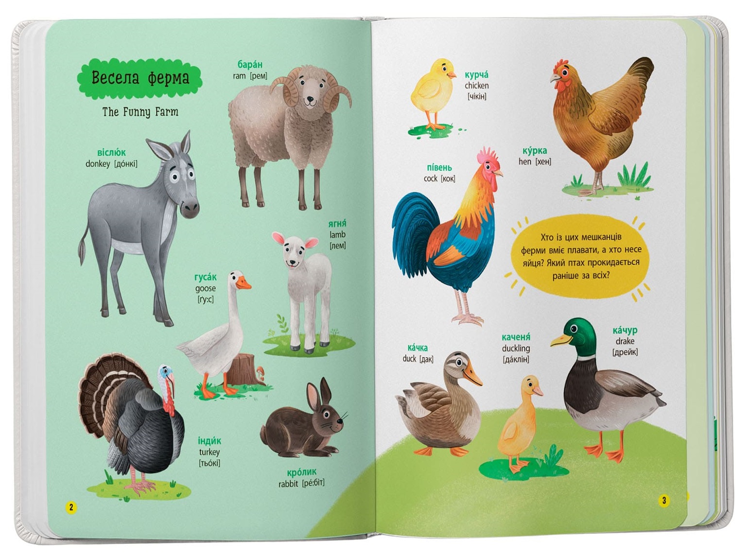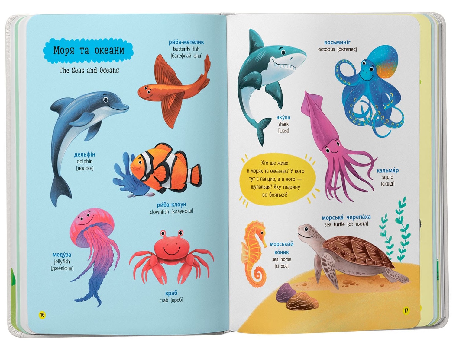 Ця книжка допоможе дитині в ігровій формі засвоїти нові слова, навчитися чітко та правильно їх вимовляти, а також сприятиме розвитку логічного мислення та вивченню навколишнього світу. На кожному розвороті малюк бачитиме великі кольорові малюнки, запам’ятовуватиме нові слова, відшукуватиме задані предмети, відповідатиме на запитання. Підписи в книжці подано двома мовами, що зробить вивчення англійської легким і веселим навіть для найменших.