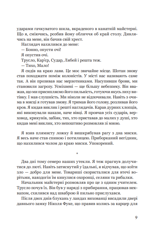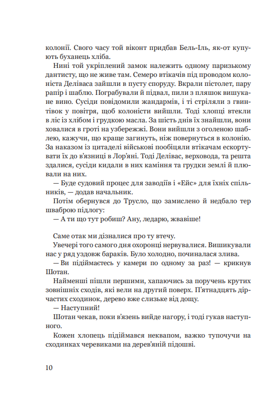 Головна тема роману сучасного французького письменника (н. 1952), написаного на основі реальних подій — бунту в дитячій колонії і втечі малолітніх в’язнів, доведених до відчаю жорстокістю наглядачів і байдужістю держави, — несамовитий порив до свободи, обстоювання людської гідності, звеличення гуманізму простих людей, які допомагають зацькованому втікачеві, людська солідарність, що інколи задля захисту добра вимагає не відступати навіть перед убивством. Є й гарні описи моря та острова, де містилась колонія, праці й побуту бретонських рибалок, перегук із політичними подіями 1930-х років. Постає й запитання: а чи все гаразд у наших колоніях та інтернатах для дітей?