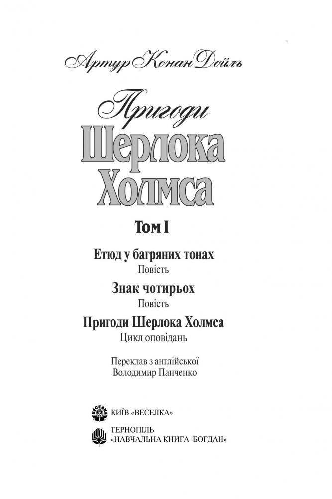 Цей том — перший із чотиритомного видання, до якого увійшли в українському перекладі усі твори англійського класика про пригоди Шерлока Холмса. В повному обсязі в Україні видаються вперше.