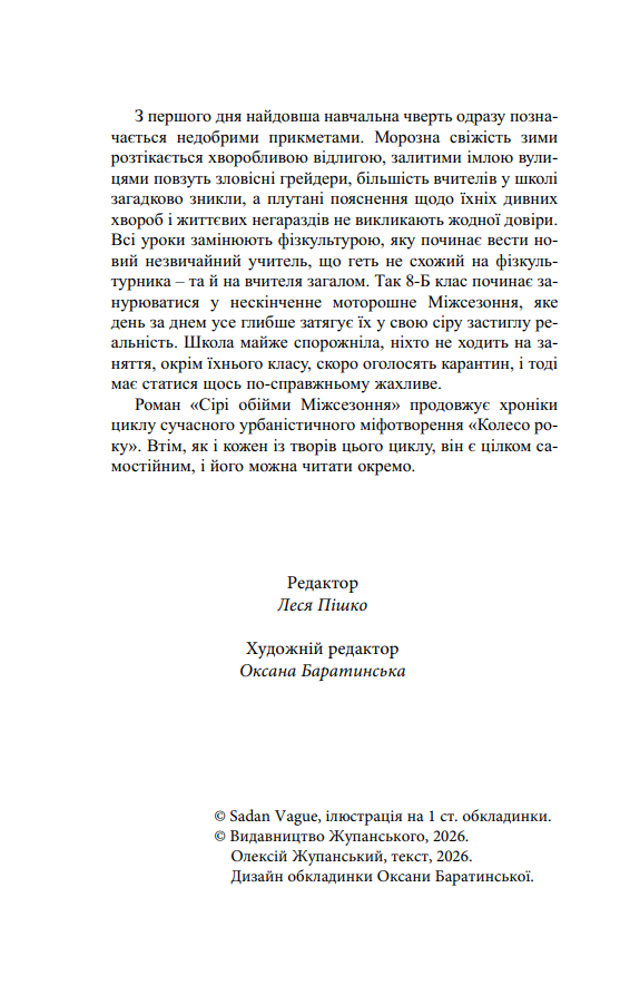 Роман «Сірі обійми Міжсезоння» продовжує хроніки циклу сучасного урбаністичного міфотворення «Колесо року». Втім, як і кожен із творів цього циклу, він є цілком самостійним, і його можна читати окремо.