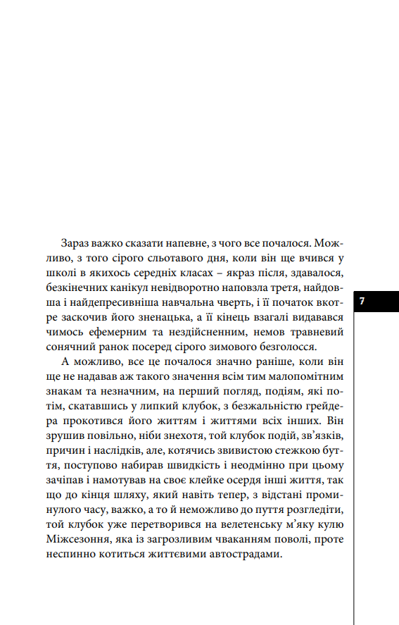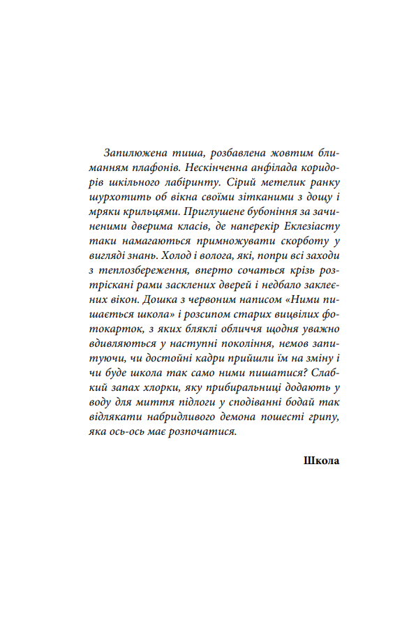 З першого дня найдовша навчальна чверть одразу позначається недобрими прикметами. Морозна свіжість зими розтікається хворобливою відлигою, залитими імлою вулицями повзуть зловісні грейдери, більшість вчителів у школі загадково зникли, а плутані пояснення щодо їхніх дивних хвороб і життєвих негараздів не викликають жодної довіри. Всі уроки замінюють фізкультурою, яку починає вести новий незвичайний учитель, що геть не схожий на фізкультурника – та й на вчителя загалом. Так 8-Б клас починає занурюватися у нескінченне моторошне Міжсезоння, яке день за днем усе глибше затягує їх у свою сіру застиглу реальність. Школа майже спорожніла, ніхто не ходить на заняття, окрім їхнього класу, скоро оголосять карантин, і тоді має статися щось по-справжньому жахливе.