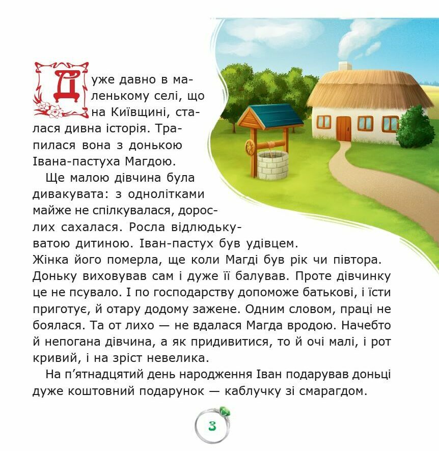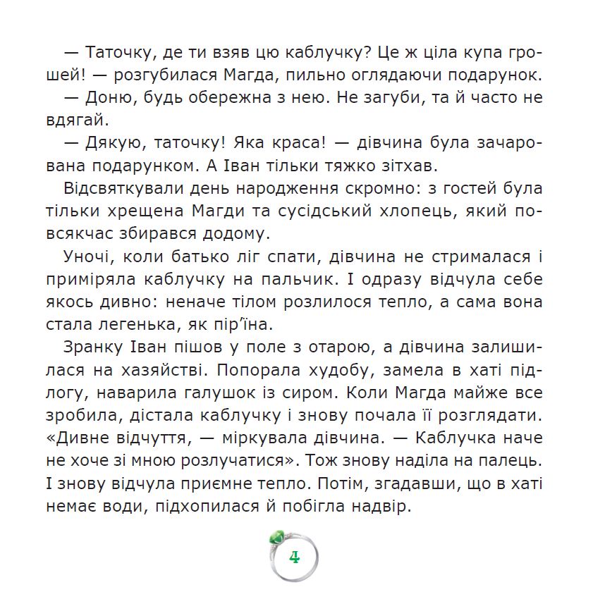 Аж ось, на свої п’ятнадцяті іменини, вона отримує від батька дивовижний подарунок — смарагдову каблучку, що має таємничу силу. І з цього дня все змінюється. Тепер кожен юнак зачарований Магдиною красою і кожен змагається за її увагу. Але чи справжнє це кохання? Або ж лише чари дорогоцінного каменя?