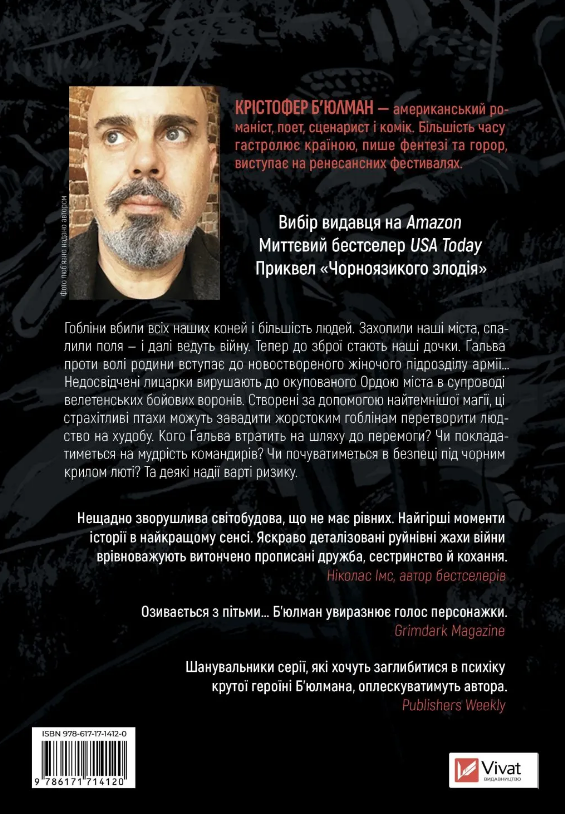 Гобліни вбили всіх наших коней і більшість людей. Захопили наші міста, спалили поля — і далі ведуть війну. Тепер до зброї стають наші дочки. Ґальва проти волі родини вступає до новоствореного жіночого підрозділу армії… Недосвідчені лицарки вирушають до окупованого Ордою міста в супроводі велетенських бойових воронів. Створені за допомогою найтемнішої магії, ці страхітливі птахи можуть завадити жорстоким гоблінам перетворити людство на худобу. Кого Ґальва втратить на шляху до перемоги? Чи покладатиметься на мудрість командирів? Чи почуватиметься в безпеці під чорним крилом люті? Та деякі надії варті ризику.