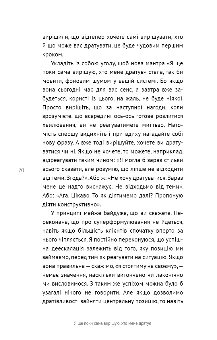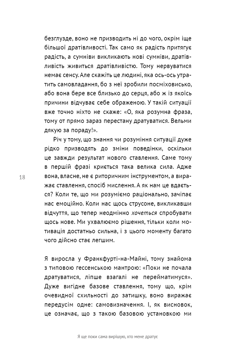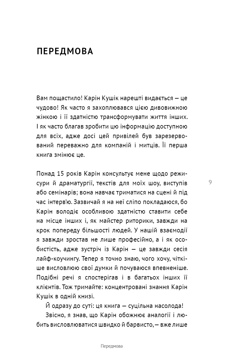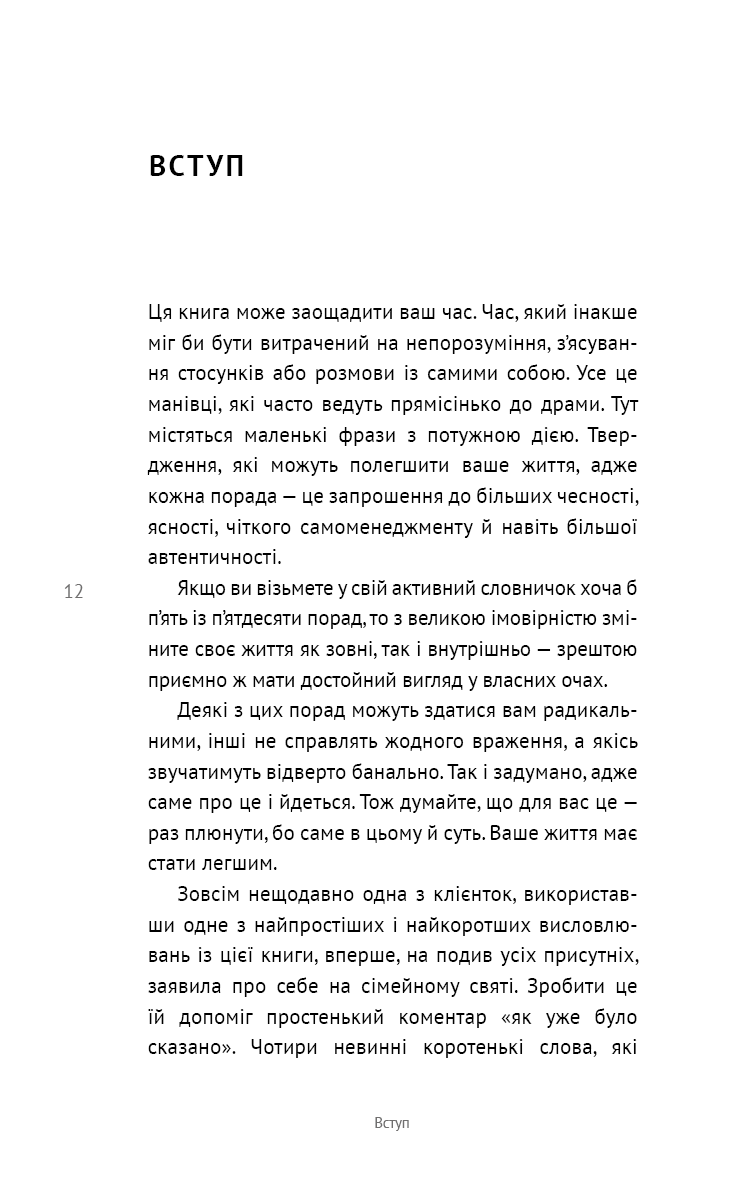 Часто лише одна влучна фраза, сказана вчасно, здатна змінити наше сприйняття ситуації, людини чи й себе самого. Саме за ці влучність, точність, чесність і відвертість Карін Кушік вдячні тисячі її клієнтів і читачів, яким вона допомогла зрозуміти найважливіші в їхньому житті речі. Понад 20-річний досвід роботи із представниками топ-менеджменту великих компаній, акторами, бізнесменами дав їй можливість збагнути, що саме потрібно для досягнення успіху, добробуту, достатку, а головне — внутрішньої рівноваги. Ці знання вона сформулювала в 50 фразах, які можуть полегшити ваше життя.