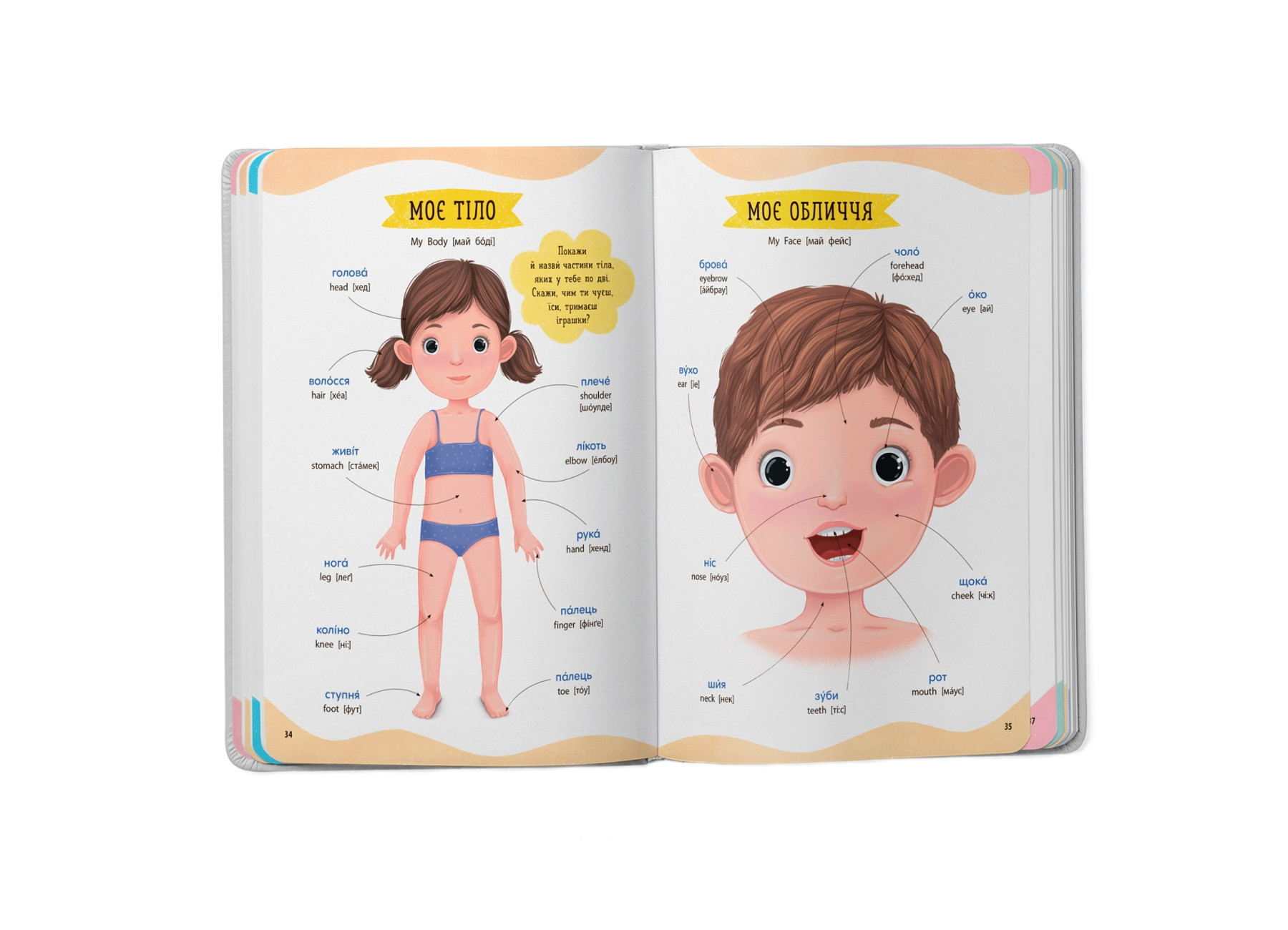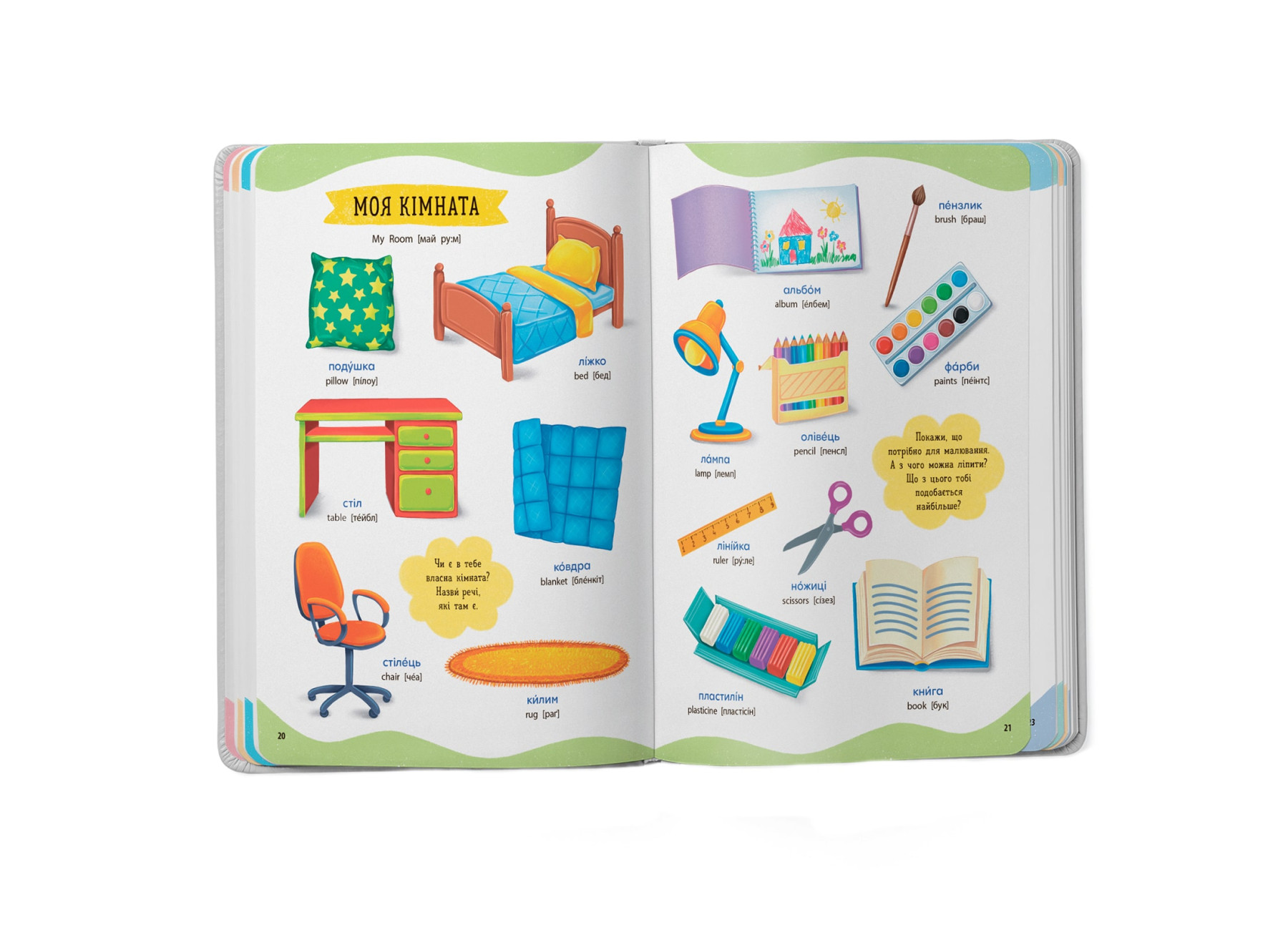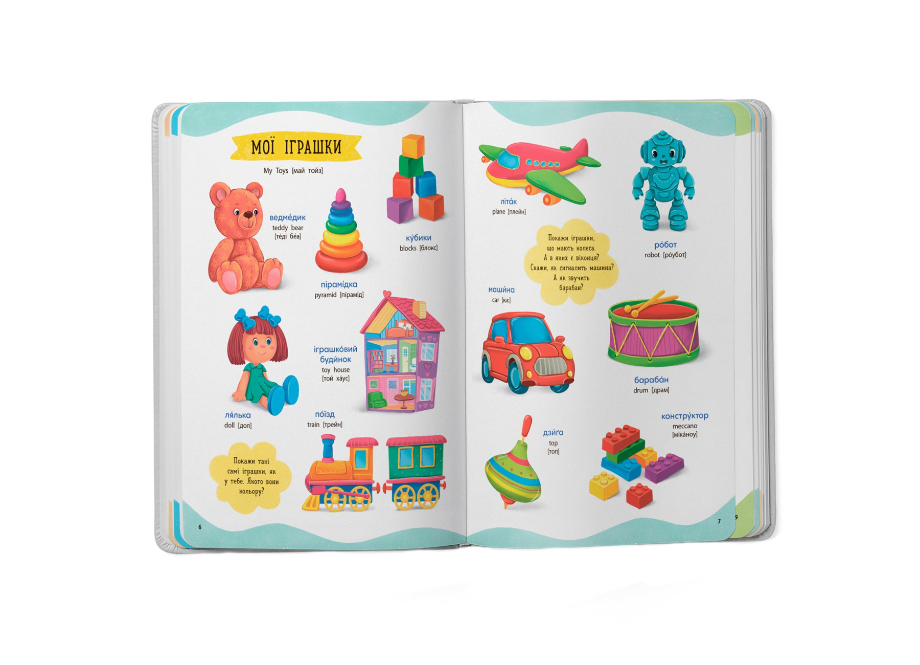 Ця книжка допоможе дитині в ігровій формі дізнатися нові слова, зробити перші кроки у вивченні навколишнього світу, розвинути мовлення та логічне мислення, навчитися чіткій та правильній вимові, розширить словниковий запас. На кожному розвороті малюк розглядатиме великі кольорові малюнки і дізнаватиметься нові слова, відшукуватиме задані предмети, відповідатиме на запитання. Підписи у книжці подано двома мовами, що дозволить прищеплювати знання англійської із самого малечку.