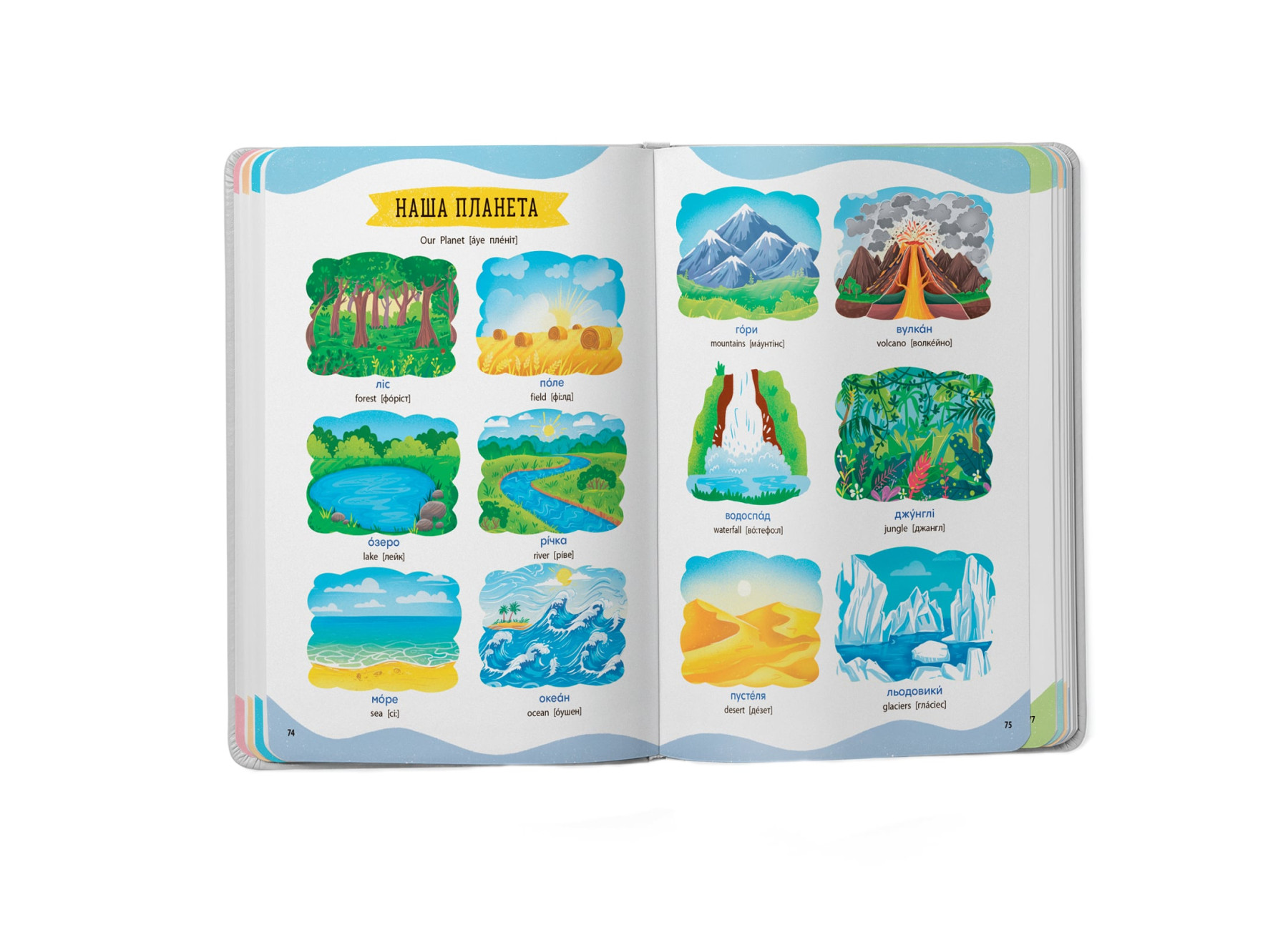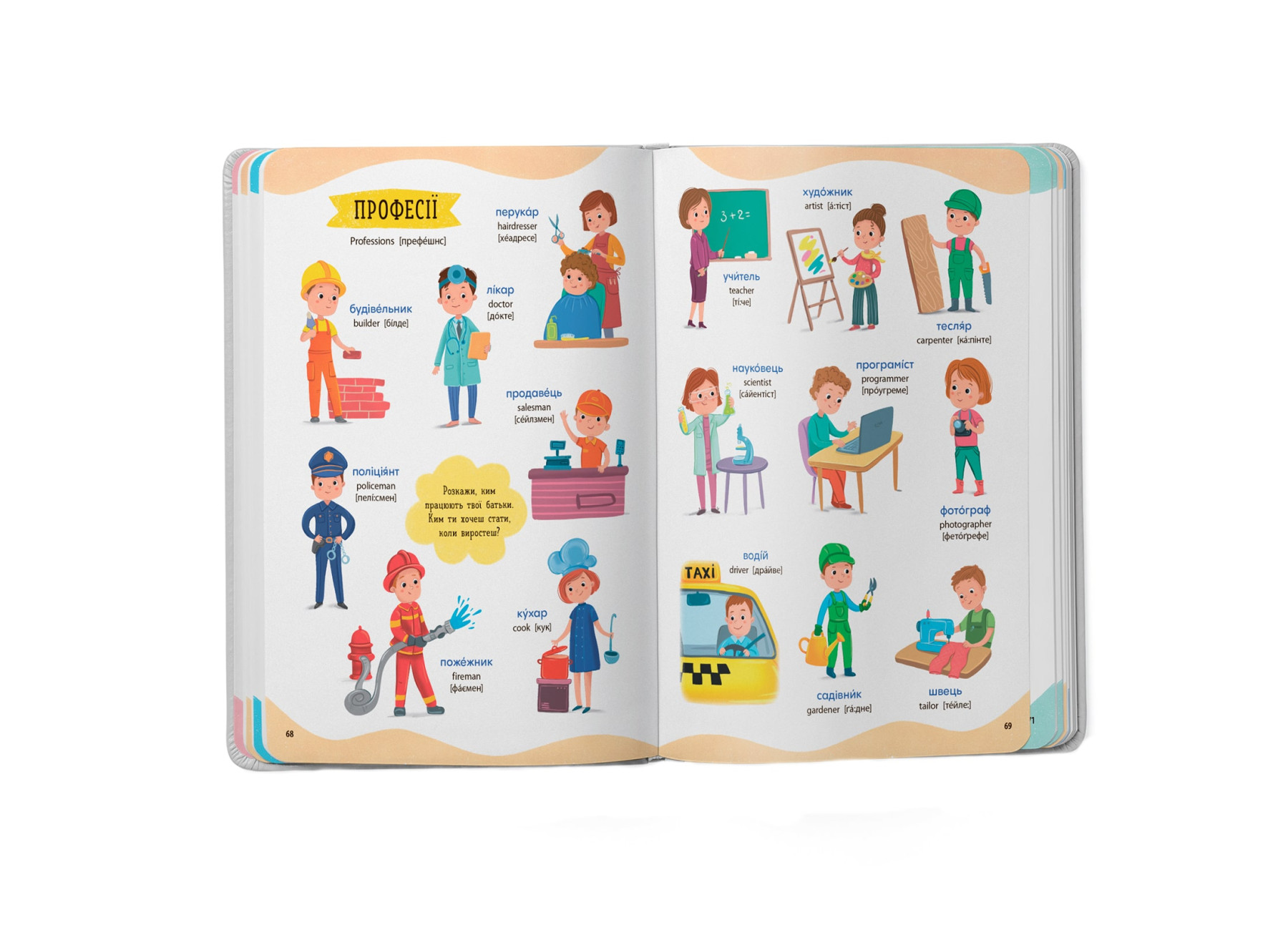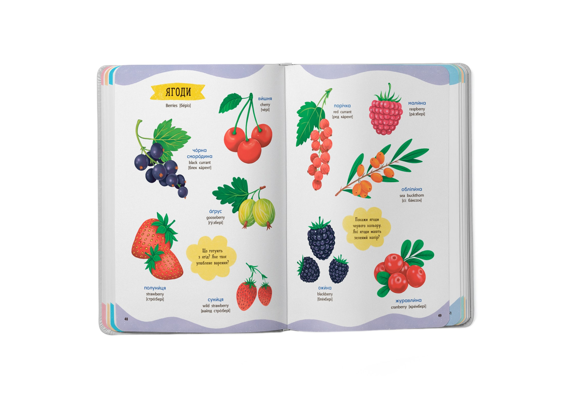Ця книжка допоможе дитині в ігровій формі дізнатися нові слова, зробити перші кроки у вивченні навколишнього світу, розвинути мовлення та логічне мислення, навчитися чіткій та правильній вимові, розширить словниковий запас. На кожному розвороті малюк розглядатиме великі кольорові малюнки і дізнаватиметься нові слова, відшукуватиме задані предмети, відповідатиме на запитання. Підписи у книжці подано двома мовами, що дозволить прищеплювати знання англійської із самого малечку.
