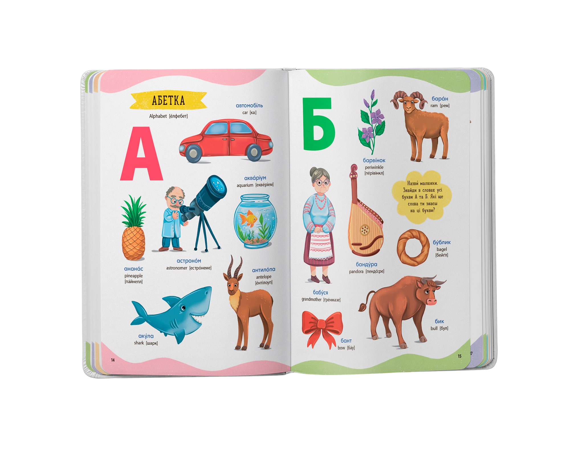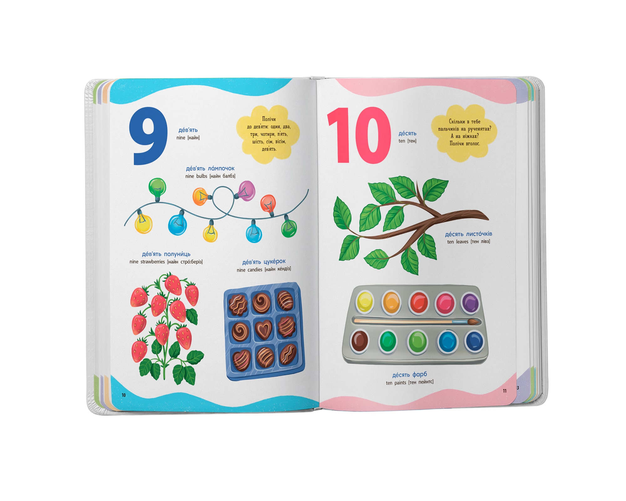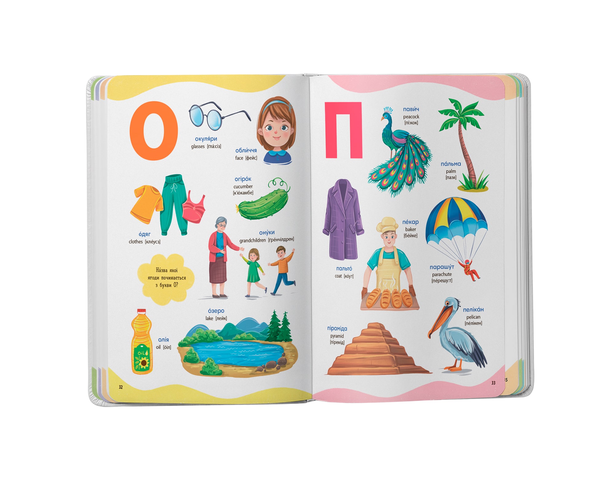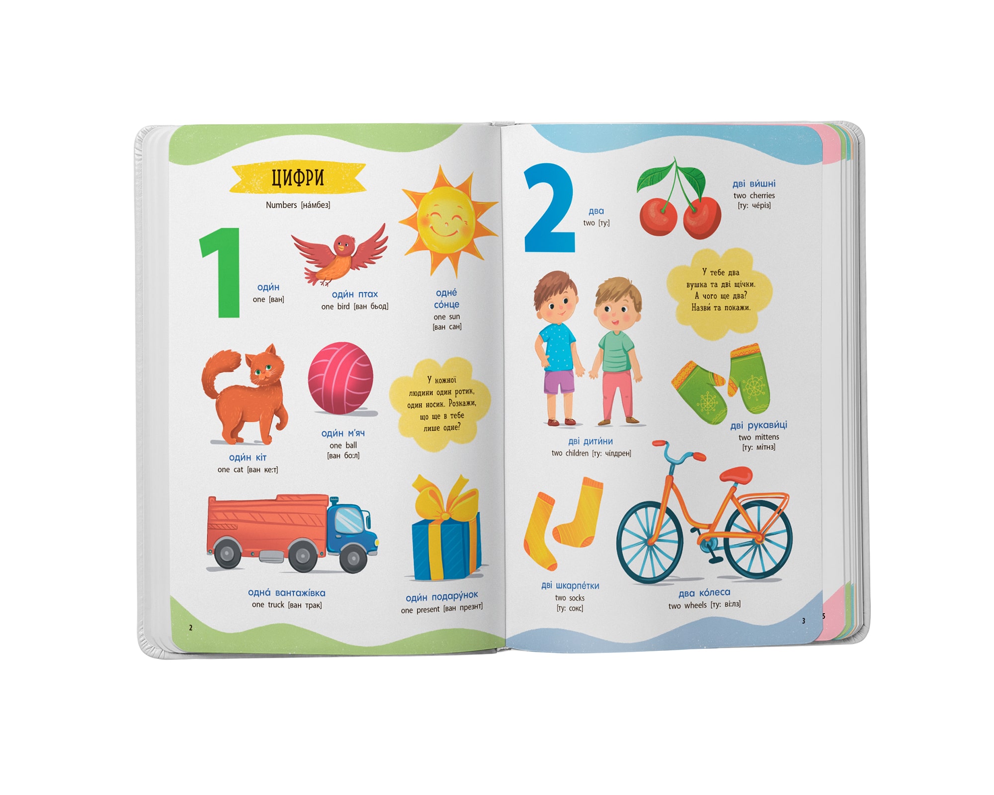 Ця книжка допоможе дошкільнику в ігровій формі засвоїти нові слова, розширити знання про навколишній світ, розвинути мовлення та логічне мислення, навчитися чіткій та правильній вимові, поповнити словниковий запас. На кожному розвороті дитина бачитиме великі кольорові малюнки і вивчатиме нові слова, відшукуватиме задані предмети, відповідатиме на запитання. Підписи в книжці подано двома мовами, що дозволить прищеплювати знання англійської із самого малечку.