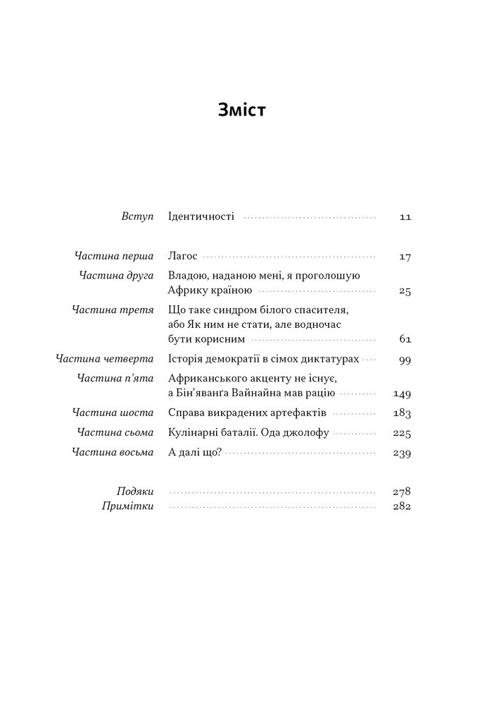 Написана з гумором і знанням справи, книжка послідовно розвінчує найпоширеніші міфи про строкатий континент, розказує нам про справжню і багатоголосу Африку. Як з’являються та діють місцеві авторитарні режими? Що стоїть за феноменом Ноллівуду? Чому 90 відсотків матеріальної культурної спадщини Африки перебуває за її межами? Як правильно їсти джолоф? І врешті — чи потрібно насправді «рятувати Африку»?