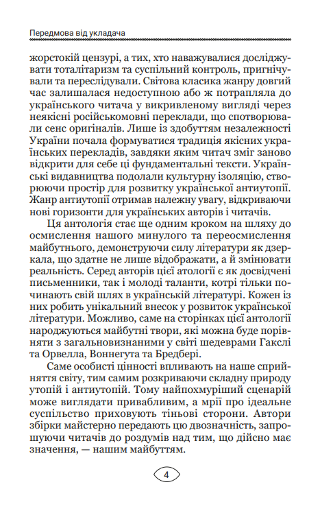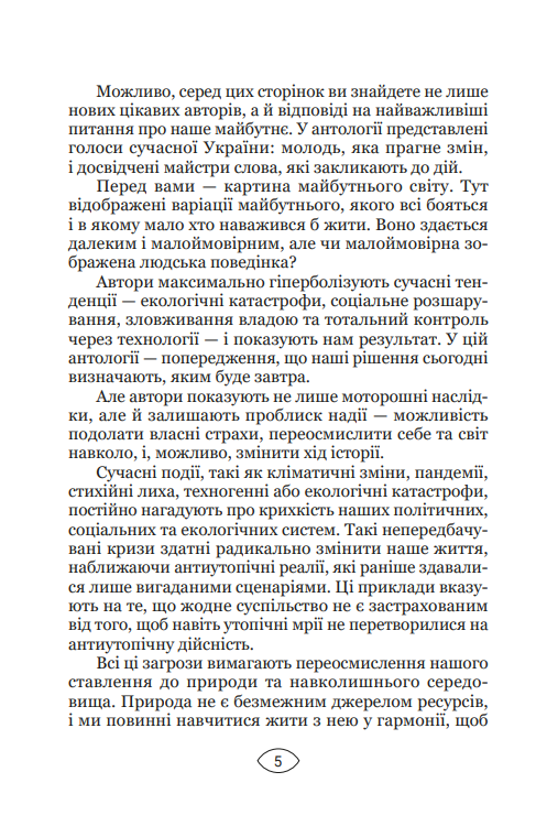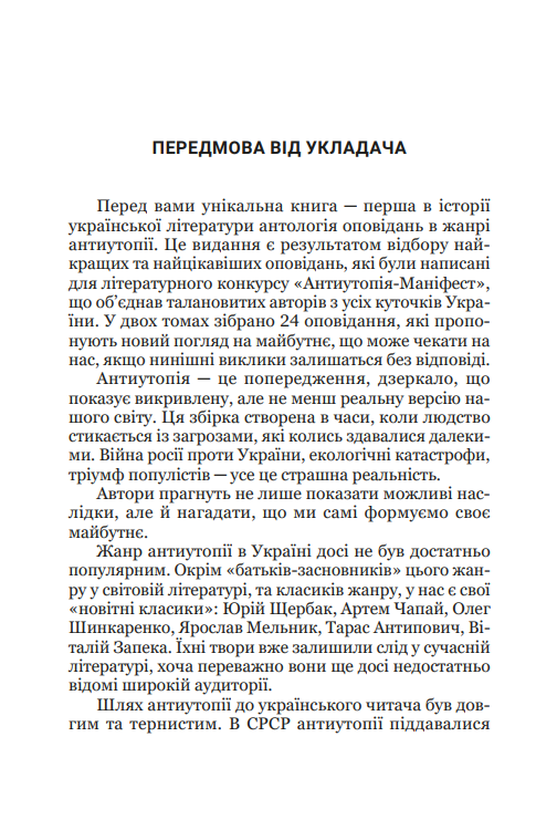 Перший том антології «Антиутопія: маніфест» — це 12 фрагментів майбутнього, що стукає у наші двері. «Уламки майбутнього» — історії про світ, який може розсипатися. І він ближче, ніж здається. Бурхливий розвиток технології, війни за ресурси, екологічні проблеми, контроль над суспільним і приватним життям — ці тривожні теми хвилюють багатьох людей. Автори зібрали мозаїку потенційної реальності. Це історії про страх і надію, про гвинтики у системі й особистості, які чинять спротив тотальному контролю. Письменники мають свої погляди на загрози, з якими людство може зіткнутися, якщо соціальні й екологічні проблеми залишаться невирішеними. Це попередження про майбутні ризики і необхідність позитивних змін.