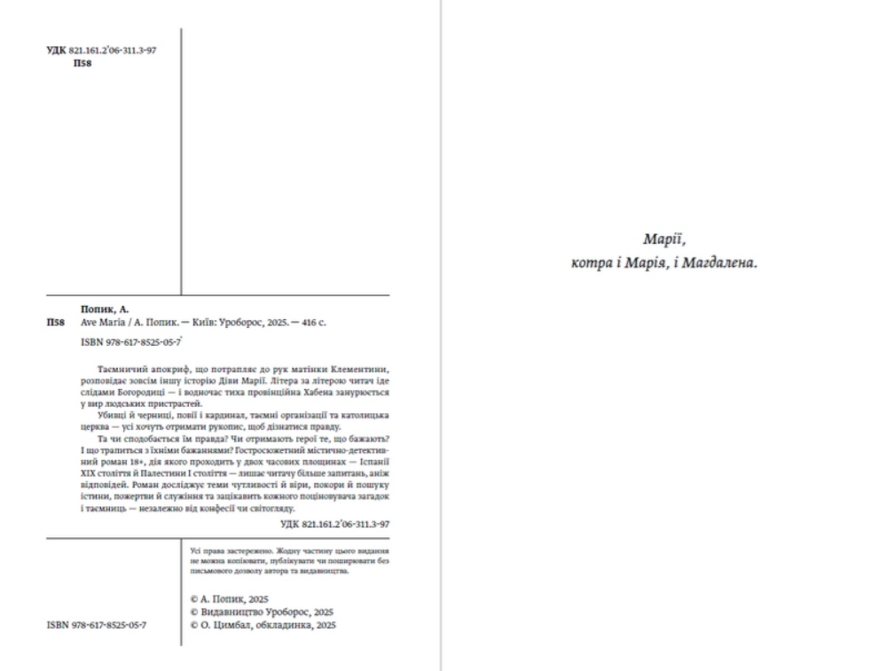 Таємничий апокриф, що потрапляє до рук матінки Клементини, розповідає зовсім іншу історію Діви Марії. Літера за літерою читач іде слідами Богородиці — і водночас тиха провінційна Хабена занурюється у вир людських пристрастей.