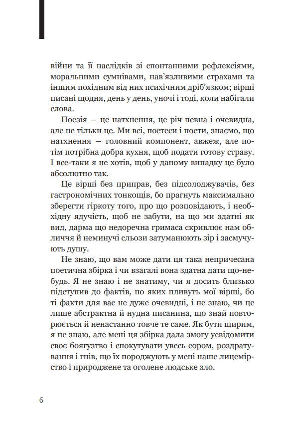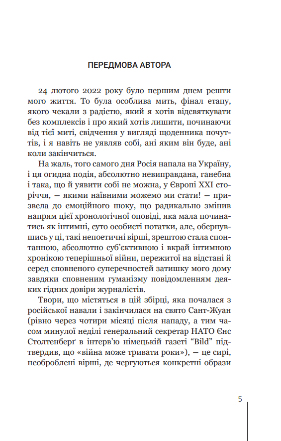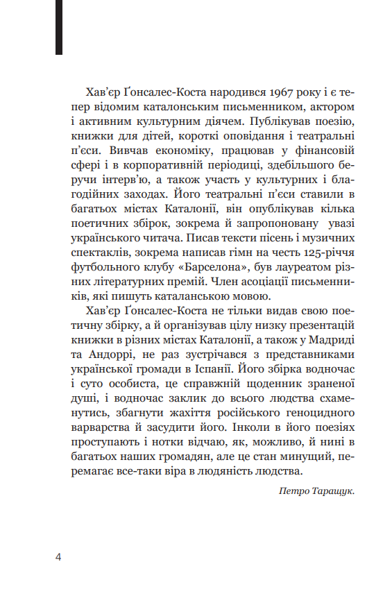 У книжці відомого каталонського поета й культурного діяча (н. 1967 р.) перед нами проминають перші чотири місяці великої російсько-української війни, це поетичний щоденник зраненої душі поета, тяжко враженого новочасним дикунством, жорстокістю світу, пронизаного ідеями, у нашому випадку — примарної величі. Ця книжка — своєрідний монумент гуманізму, неподільності людських доль і країн.