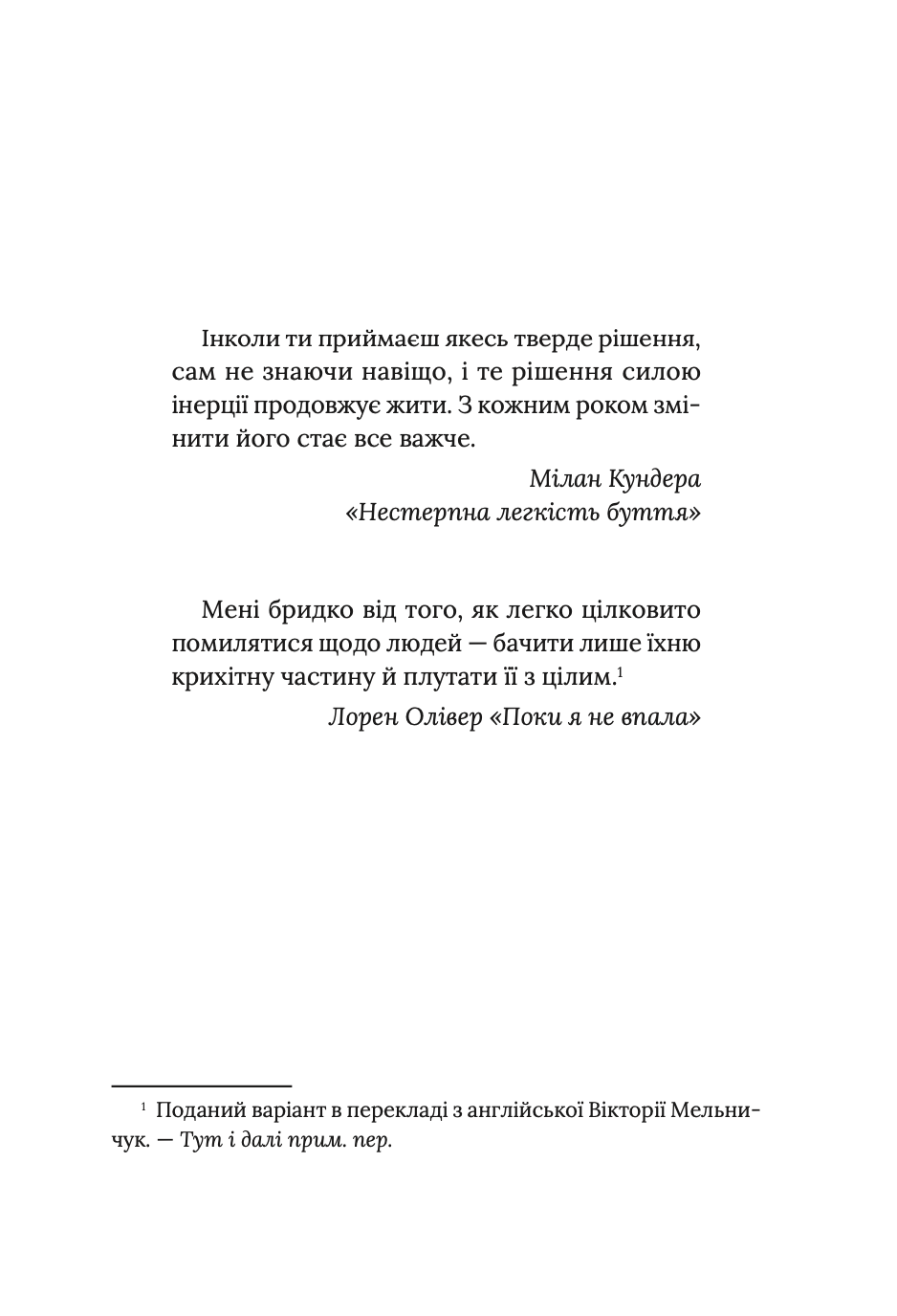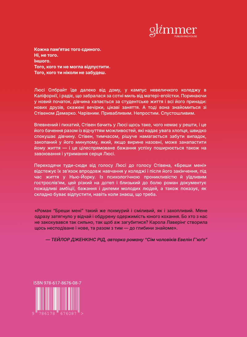 Кожна пам'ятає того єдиного. Того, кого не змогла забути. Люсі Обрайт їде далеко від дому, у кампус невеличкого коледжу в Каліфорнії, і радіє, що забралася за сотні миль від матері-егоїстки. Поринаючи у новий початок, дівчина хапається за студентське життя і всі його принади: нових друзів, скажені вечірки, цікаві заняття. А тоді вона знайомиться зі Стівеном Демарко. Чарівним. Привабливим. Непростим. Спустошливим. Впевнений і пихатий, Стівен бачить у Люсі щось таке, чого немає у решти, і це його бачення разом із відчуттям можливостей, які надає увага хлопця, швидко спокушає дівчину. Стівен, тимчасом, рішуче намагається забути випадок, закопаний у його минулому, який, якщо вирине назовні, може занапастити йому життя — і це цілеспрямоване бажання успіху поширюється також на завоювання і утримання серця Люсі. Переходячи туди-сюди від голосу Люсі до голосу Стівена, «Бреши мені» відстежує їх звʼязок впродовж навчання у коледжі і після його закінчення, під час життя у Нью-Йорку. Із психологічною проникливістю, цей близький до болю роман документує пожадливі амбіції, бажання і дилеми молодих людей, а також показує, як складно буває відпустити, навіть коли знаєш, що треба.