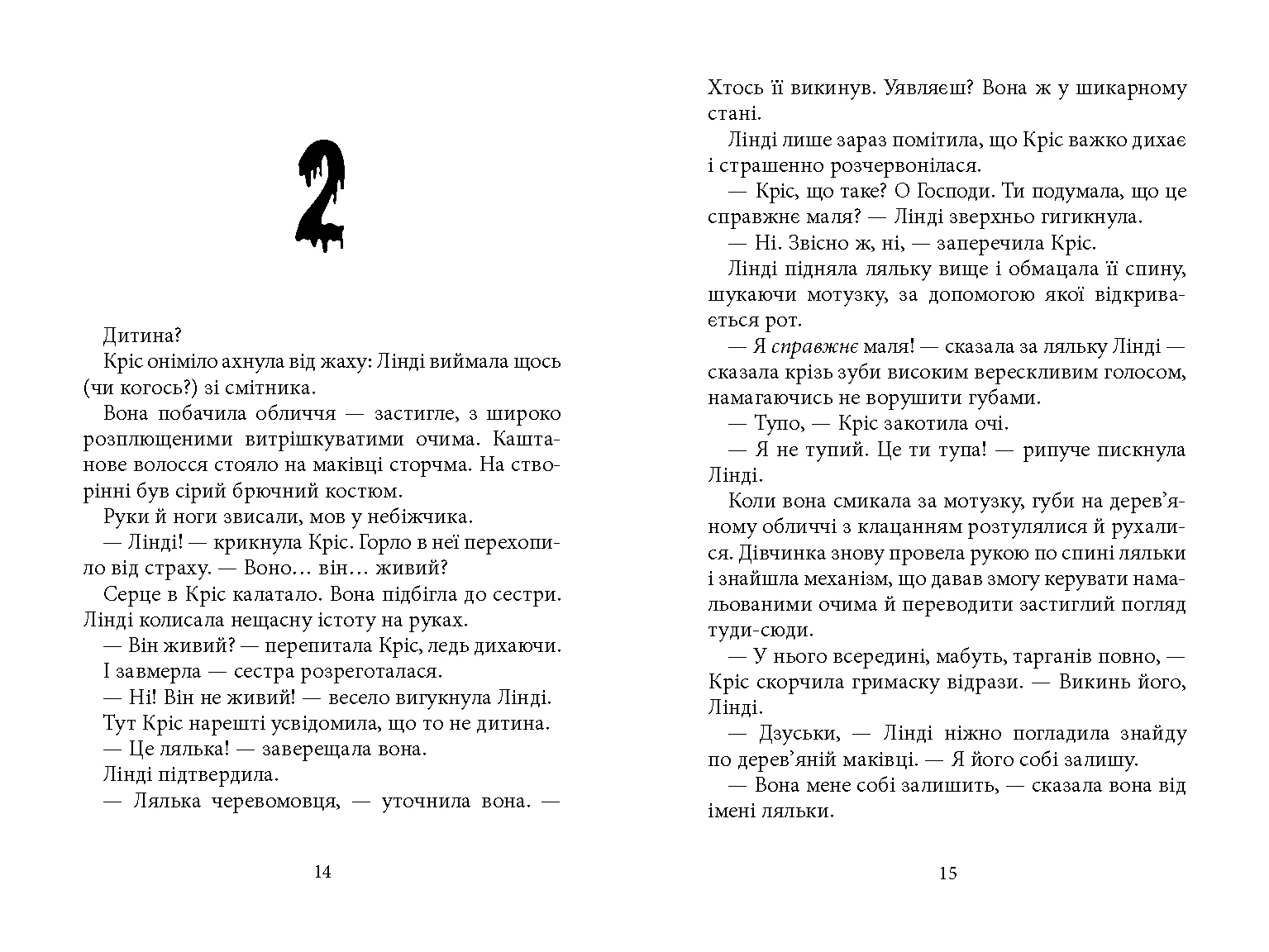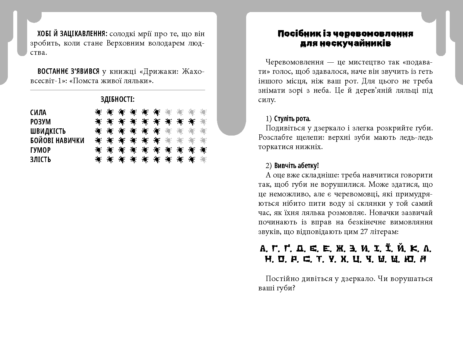 ...Близнючки Лінді і Кріс знаходять на звалищі черевомовницьку ляльку. Лінді «рятує» її, бере собі й називає Ляскалом. Але Кріс шаленіє від заздрощів. Так нечесно! Чому всі радощі-веселощі і вся увага завжди дістаються Лінді? Кріс вирішує завести ляльку й собі. Вона покаже цій Лінді! Аж тут починає коїтися щось дивне. Мерзенне. Моторошне. Не може бути, щоб усе це чинила якась дерев’яна лялька! Чи, може, може?..