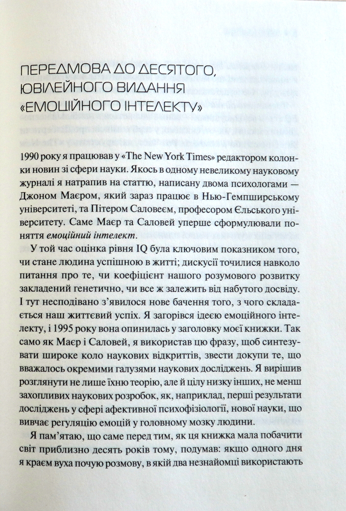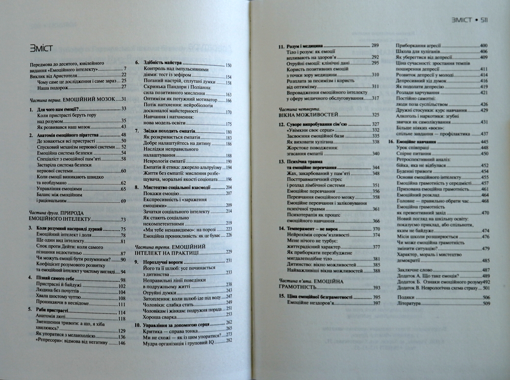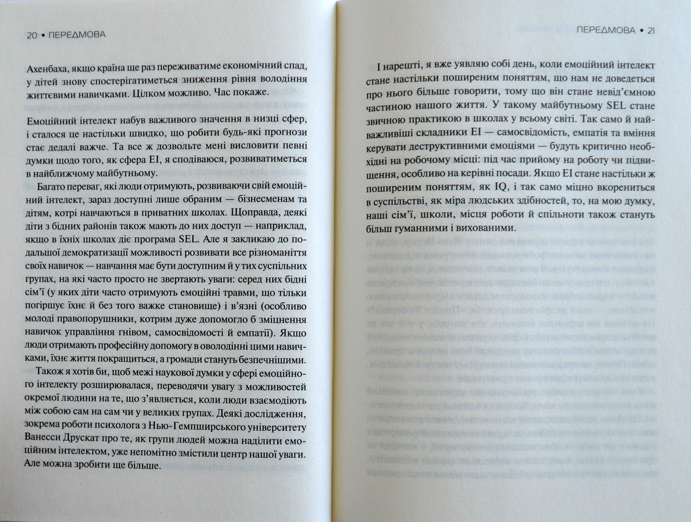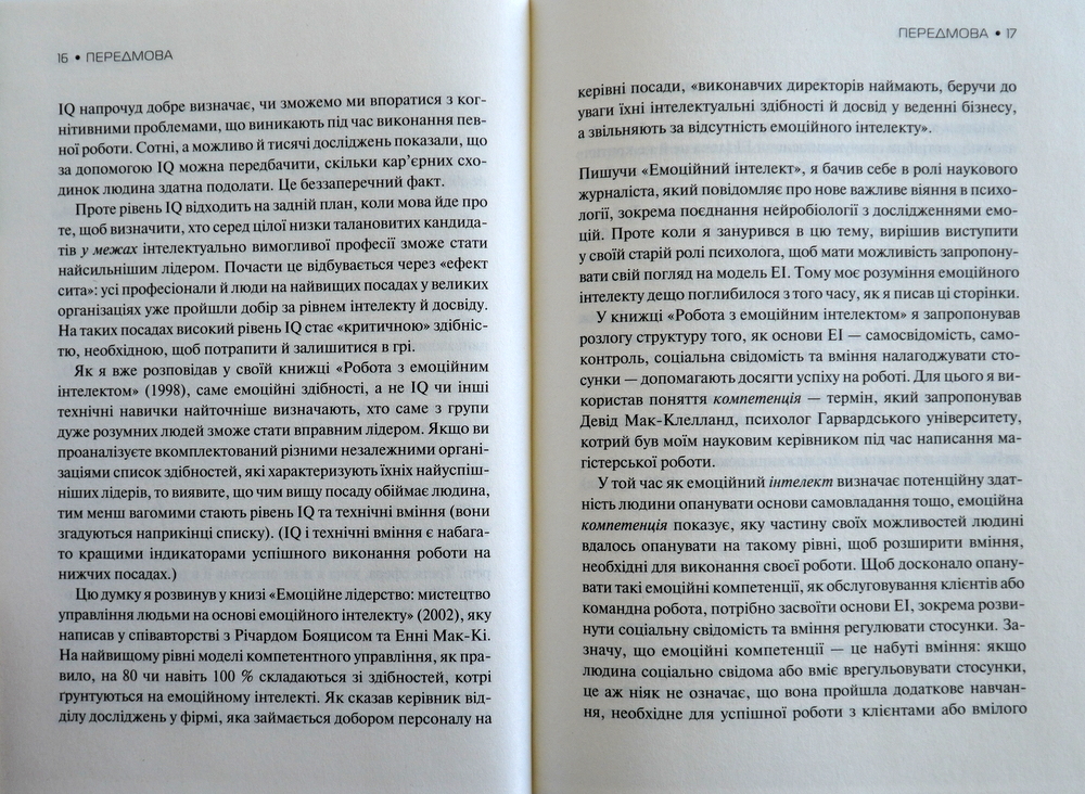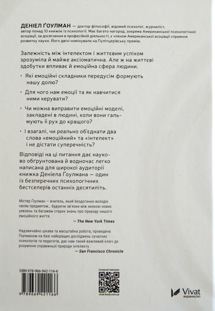 Емоційний інтелект та рівень IQ – чи пов'язані вони між собою? Чому люди з високим рівнем інтелекту не завжди успішні в житті? Що впливає на формування емоційного інтелекту у дитячому віці? Яка роль батьків у розвитку дитини? Чому дитинство є важливим етапом життя, на якому формуються звички, нахили людини? Чому з віком так важко змінюватися та навчатися? Книга «Емоційний інтелект» під авторством Даніела Гоулмана дає відповіді на безліч таких запитань. Вона доповнена яскравими прикладами із практики, є описи результатів психологічних експериментів, які проводилися в різноманітних закладах США та показали взаємозв'язок між почуттями людей та розвитком взаємовідносин.