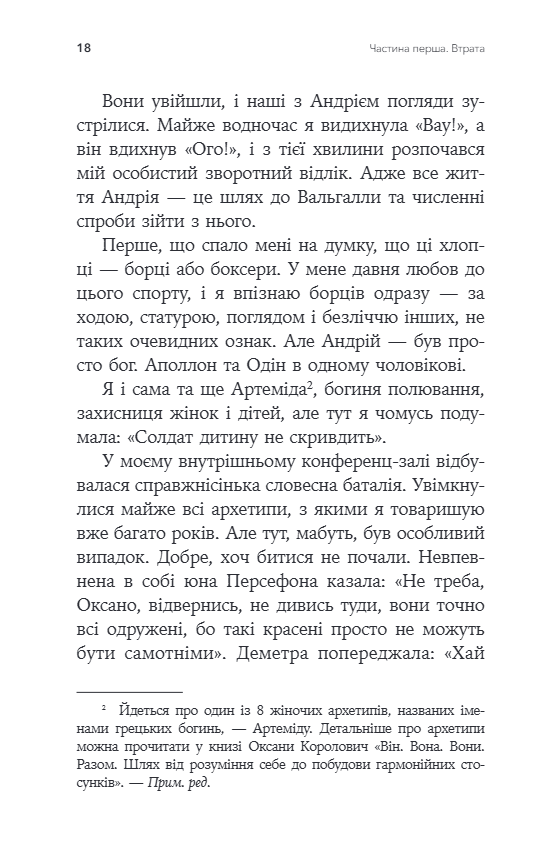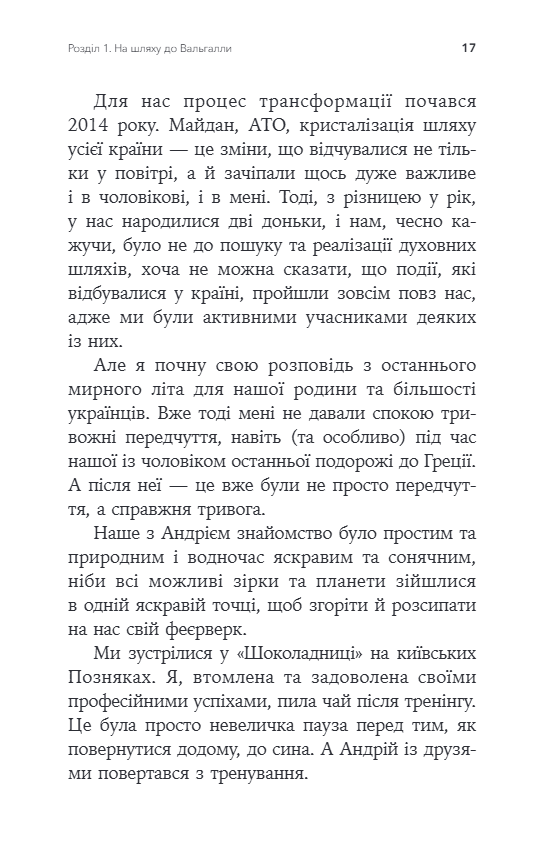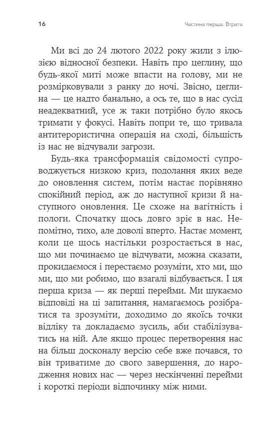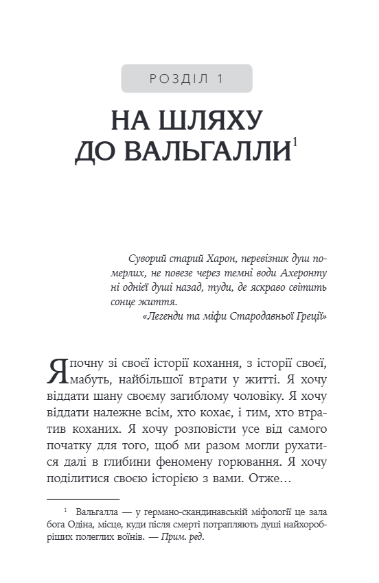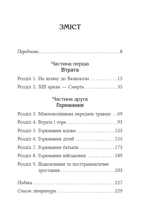 Автор пояснює характер горя просто та гуманно, поєднуючи професійні психологічні знання та особистий досвід втрати чоловіка на війні. У першій частині книги вона досліджує феномен смерті, духовне розуміння втрати, міжпоколінські травми та архаїчні уявлення наших предків про життя та смерть. Це філософське і в той же час дуже особисте введення, яке допомагає бачити горе не як кінець, а як перехід - болісний, але здатний призвести до внутрішнього зростання.