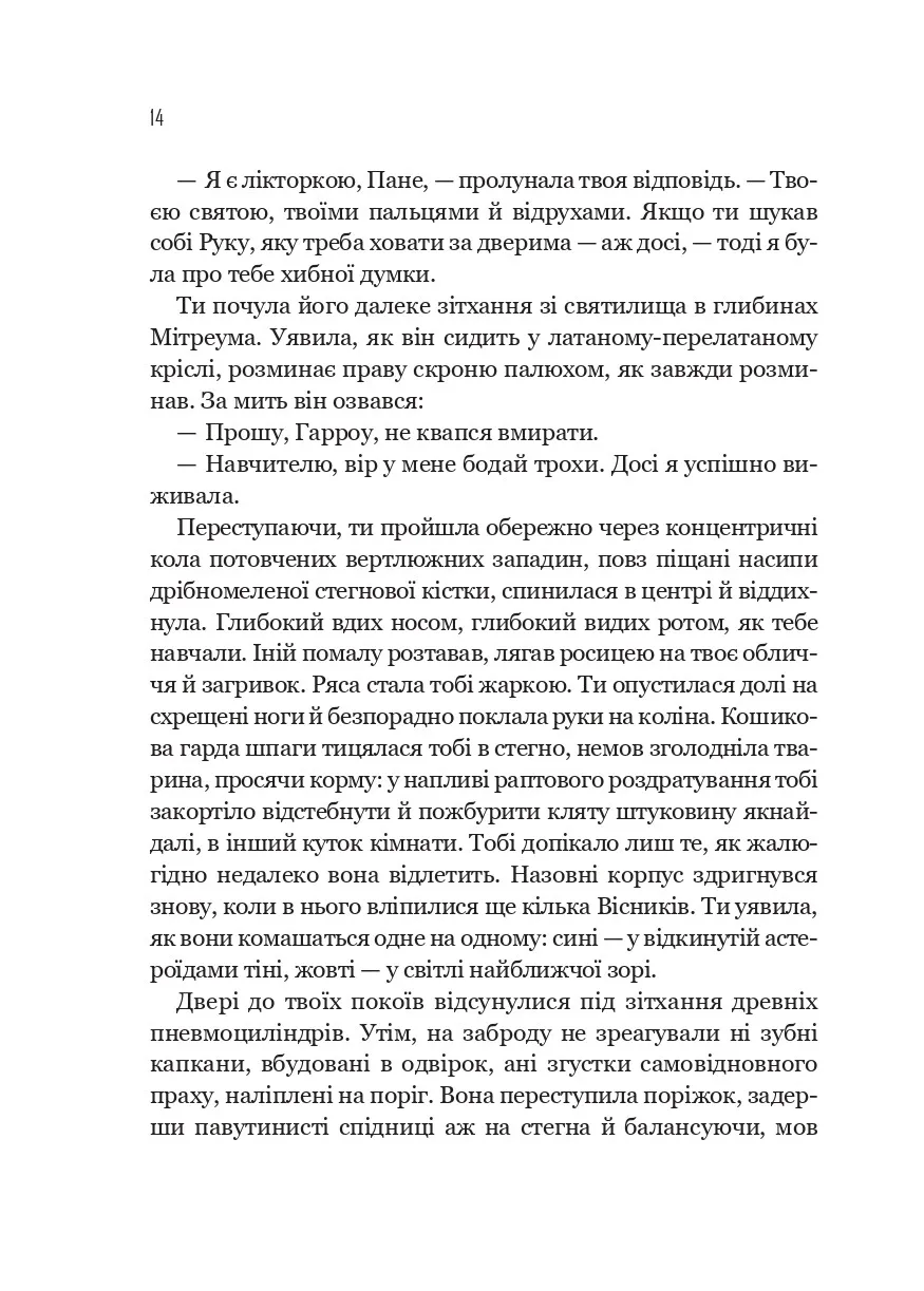 Гарроугарк Нонаджесімус обрана Імператором, щоб воювати у війні, яку неможливо виграти. Із суперницею, яку вона на дух терпіти не може, Гарроу має відточити свої вміння до досконалості. Проте здоров’я останньої некромантки Дев’ятого Дому погіршується, меч викликає нудоту, а власний розум загрожує зрадити. Ніщо не є таким, яким здається, в залах Імператора. Полишена в темряві разом із непривітними наставниками, переслідувана збожеволілим привидом убитої планети, Гарроугарк повинна знайти відповіді на два небажані запитання: чи хтось намагається її вбити? І якщо так — чи став би всесвіт від цього кращим?