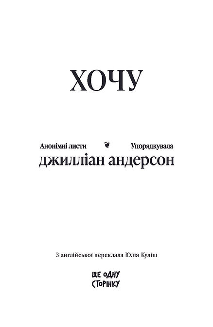 У цій визначальній для покоління книжці Джилліан Андерсон зібрала і представила анонімні листи сотень жінок з усього світу (разом зі своїм власним анонімним листом). «ХОЧУ» показує, як жінки ставляться до сексу, коли мають цілковиту свободу й анонімність.