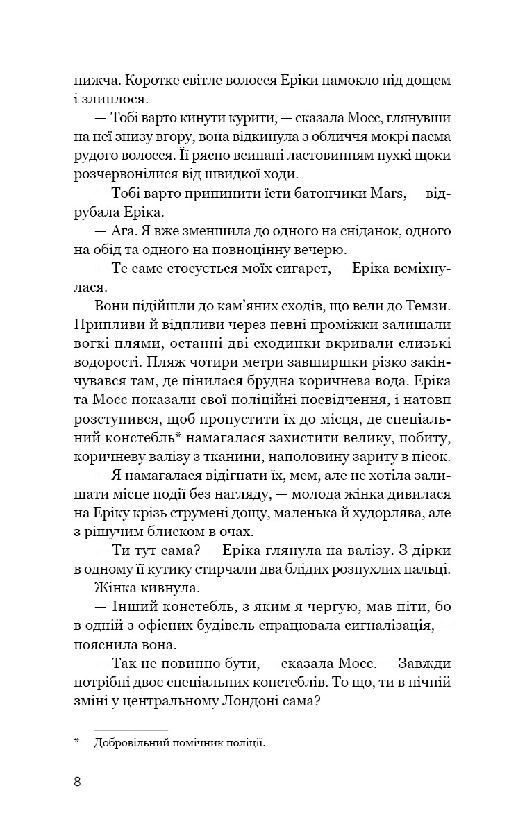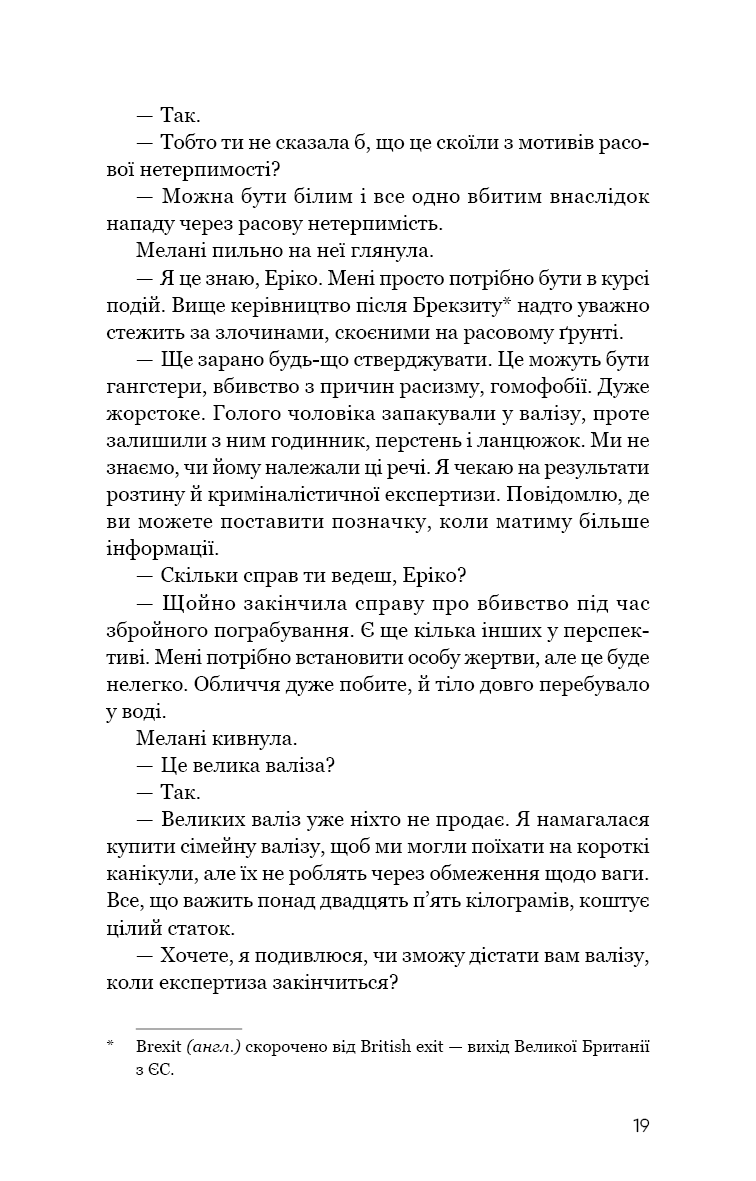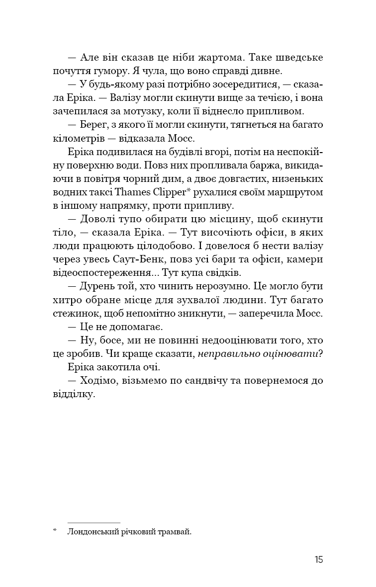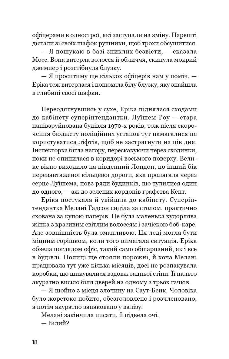 Дощовим осіннім ранком до берега Темзи прибиває пошарпану валізу із моторошним вмістом: розчленованим тілом невідомого чоловіка. Але детективка Еріка Фостер не вперше стикається з таким жорстоким вбивством... Два тижні тому тіло молодої жінки було знайдено в ідентичній валізі. Що пов’язує цих двох жертв?