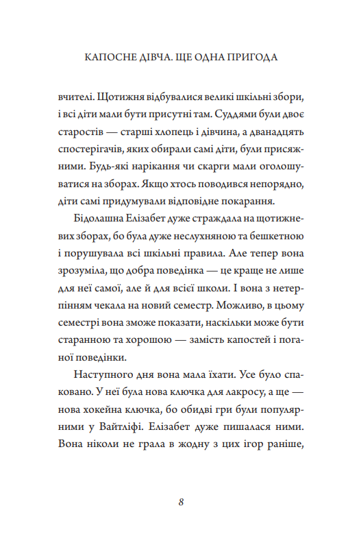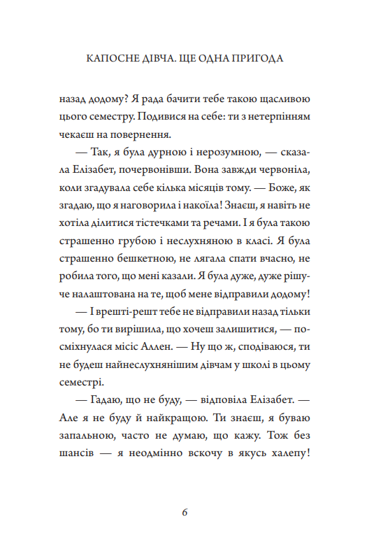 Елізабет не могла стримати радості. Довгі літні канікули добігали кінця, і настав час подумати про повернення до школи, про зустріч із друзями, за якими вона так сумувала. У цьому семестрі дівчинка твердо вирішила старанно вчитися і поводитися зразково. Та, на жаль, завжди є той, хто намагається все зіпсувати й усіляко штовхає її знову стати найнеслухнянішою дівчинкою у школі. Чи зможе Елізабет нарешті позбутися прикрого прізвиська, що так уперто тягнеться за нею, і стати однією з перших учениць класу?..
