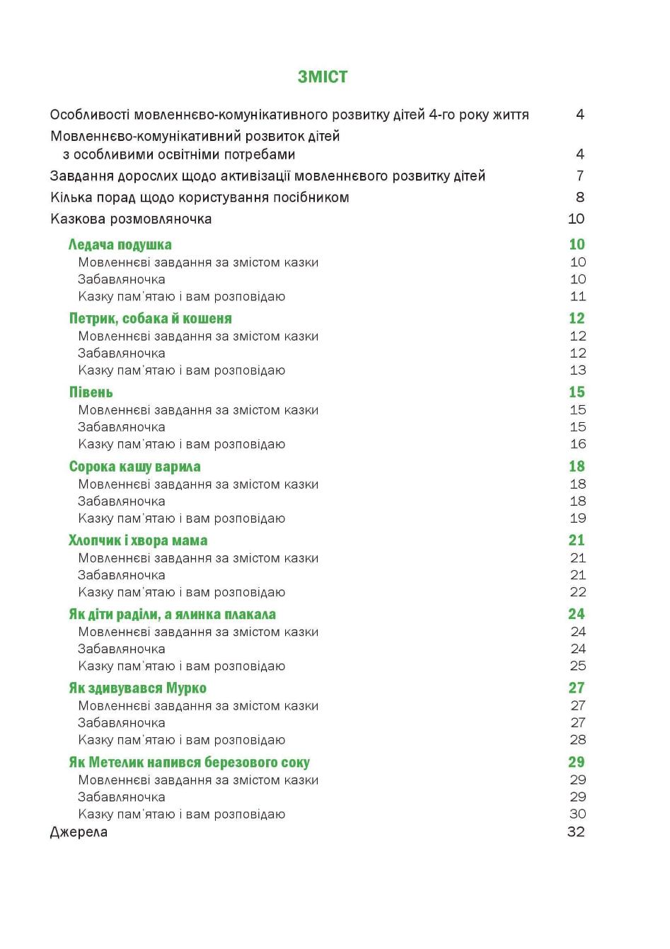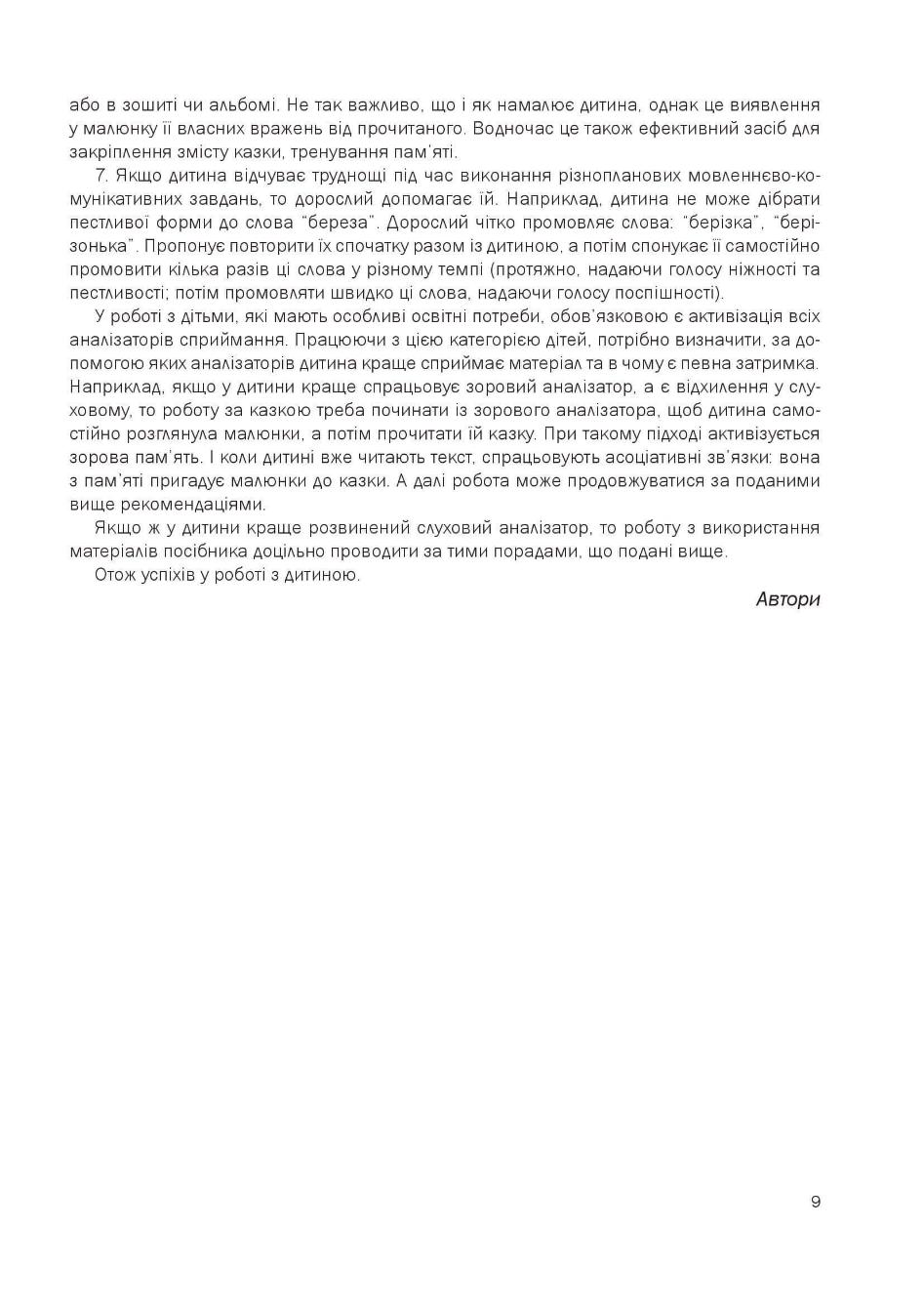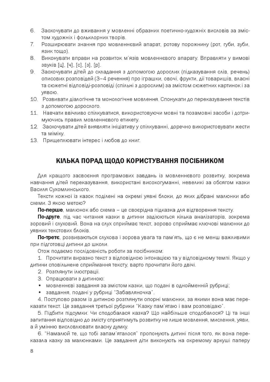 Посібник спрямований на реалізацію завдань мовленнєво-комунікативного розвитку й навчання переказування текстів за опорними малюнками дітей 4-го року життя та дітей з особливими освітніми потребами. Використовуючи тексти казок Василя Сухомлинського, батьки та педагоги матимуть змогу розвивати в дітей мислення, пам’ять, а особливо мовлення, вміння переказувати тексти, використовуючи опорні схеми-малюнки.