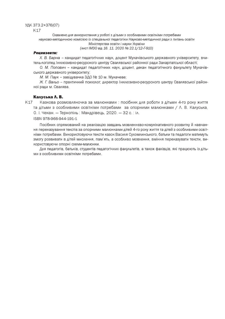 Казкова розмовляночка за малюнками: посібник для роботи з дітьми 4-го року життя та дітьми з особливими освітніми потребами за опорними малюнками | Любомира Калуська, Оксана Чекан