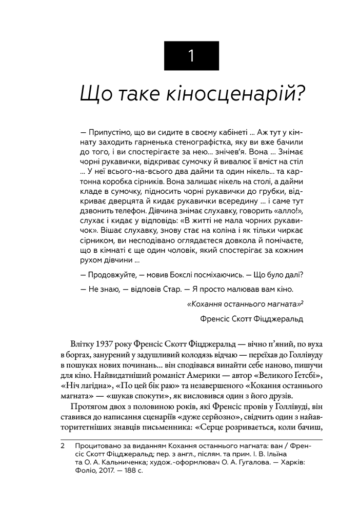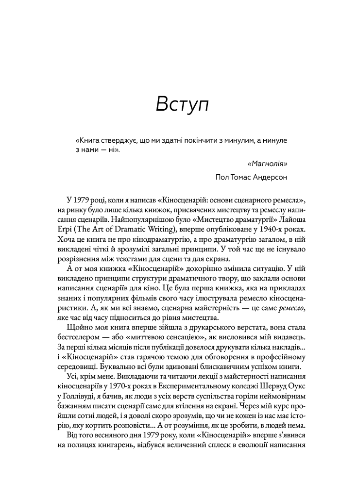 Книга «Кіносценарій» відомого американського теоретика Сіда Філда є класичним посібником для всіх, хто прагне опанувати мистецтво написання сценаріїв. Автор систематизує основні принципи побудови драматургії, пояснює структуру сценарію — від експозиції до кульмінації та розв’язки — і докладно розглядає триактну модель, яка стала стандартом у світовій кіноіндустрії. На численних прикладах із відомих фільмів Філд демонструє, як створювати переконливих персонажів, динамічний сюжет і драматичну напругу.У книзі ви дізнаєтесь:- чому перші десять сторінок сценарію мають вирішальне значення для продюсерів і редакторів;- чому структура і персонажі є основою будь-якої кінорозповіді;- як адаптувати роман, п’єсу чи статтю у сценарій, придатний для екранізації;- як захистити свої авторські права та оформити юридичне право на сценарій;- як створювати правдиві діалоги, глибоких героїв і динамічний сюжет, уникаючи шаблонів.Цей посібник вважається золотим стандартом індустрії в усьому світі, він надихнув чимало сценаристів на створення успішних творів кіно та телебачення.