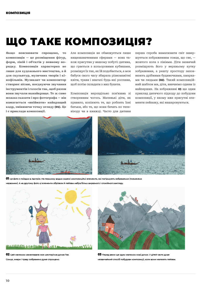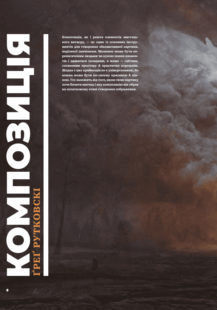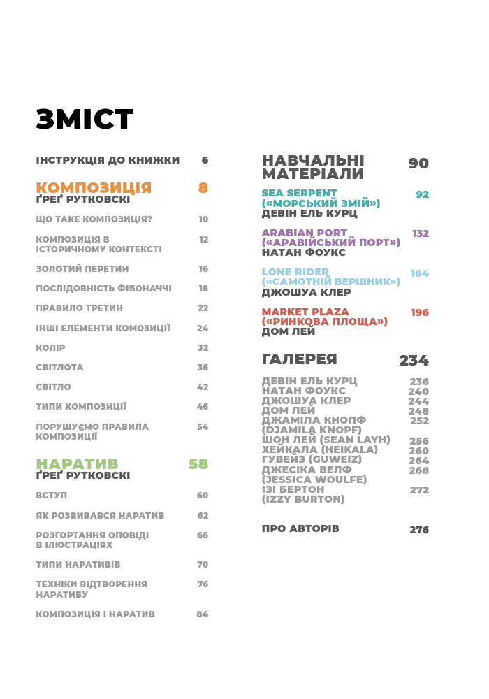У серії «Від майстрів мистецтва» зібрано художників, які малюють звичайними фарбами, і тих, які створюють цифрові зображення.Книжка «Композиція і наратив» — друга в серії «Від майстрів мистецтва» після бестселера «Колір і світло». Вона складається з трьох розділів — теорії, навчальних матеріалів і галереї.У першому розділі розглянуто теоретичні засади побудови композиції та її використання в мистецтві, від наскельних малюнків — і аж до шедеврів сучасного цифрового мистецтва. Ви дізнаєтеся про золотий перетин, послідовність Фібоначчі, правило третин і про композиційні елементи — фігури, наближеність і масштаб, ритм і рух, перспективу, текстуру й контраст. Ви навчитеся правильно використовувати в композиції колір, світлоту й світло, потім перейдете до вивчення типів композиції — пейзажу, портрету й натюрморту, і нарешті дізнаєтеся, як і з яких міркувань художник може порушувати правила композиції.У другому розділі розглянуто наратив і особливості оповідання історії — в окремих малюнках і в послідовності кадрів, а також способи відтворення наративу в зображенні. Ви ознайомитеся з такими техніками побудови наративу, як використання ракурсу, декорацій, точки огляду, символізму й метафор, прийомами для глибшого занурення глядача у світ картини, персоніфікації анімалістичних персонажів, перебільшення, гумору, неоднозначності елементів, а також дізнаєтеся, у чому полягає простота і складність відтворення історії за допомогою зображення. А ще тут досліджено способи посилення наративу з використанням різних технік побудови композиції, зокрема й точки огляду.Чотири частини розділу «Навчальні матеріали» — від Девіна Ель Курца, Натана Фоукса, Джошуа Клера і Дом Лей — це окремі проєкти, які стануть у пригоді лише за умови, що ви належно засвоїте знання двох вступних розділів. Кожен митець, представлений у навчальних матеріалах, має власний художній стиль, творчий досвід і вміння належно будувати композицію та відтворювати наратив у зображеннях.У «Галереї» ви ознайомитеся з іншими витворами з портфоліо чотирьох митців, які супроводжували вас у роботі з навчальними матеріалами, та ще шістьох професійних художників, які поділяться своїми цінними навичками використання технік побудови композиції та наративу в картинах.