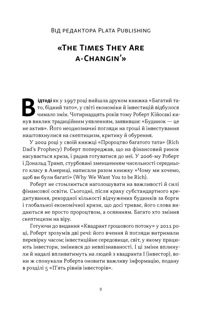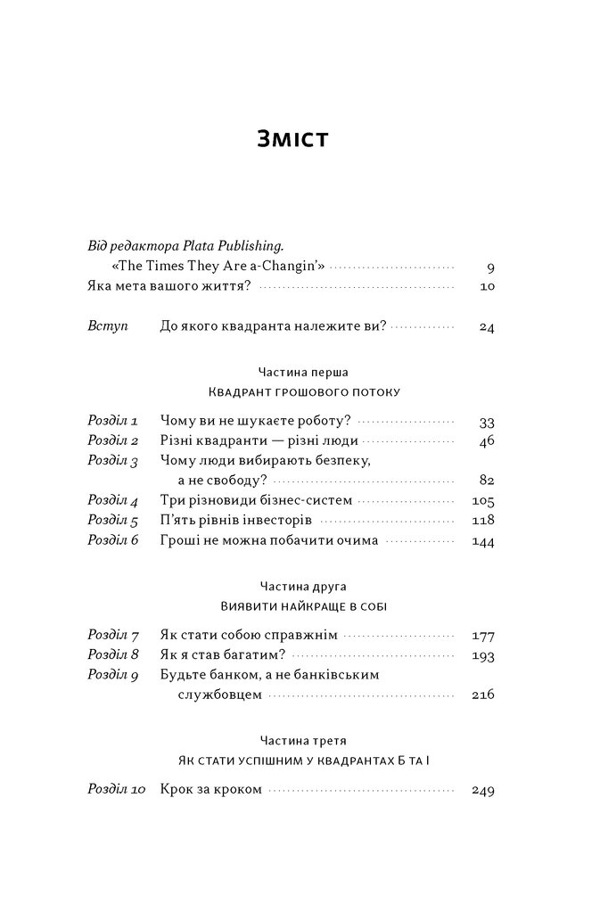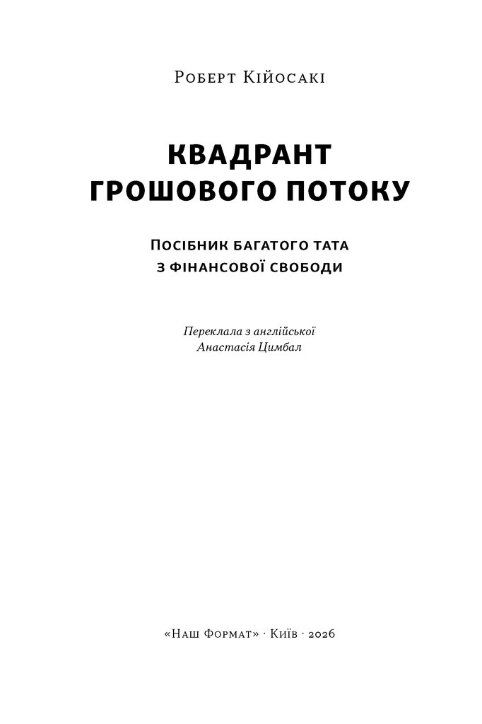 Різниця між цими порадами — не у словах, а в тому, як ви заробляєте гроші. Можна носити воду відрами або ж побудувати власний водопровід. У цій книжці Роберт Кійосакі пропонує просту й водночас революційну модель — квадрант грошового потоку E-S-B-I. Найманий працівник, самозайнятий, власник бізнесу та інвестор — чотири способи отримувати дохід і чотири різні типи мислення. Автор допомагає визначити, у якому секторі перебуваєте зараз ви, та показує шлях переходу до тих квадрантів, де ви знайдете суттєві податкові переваги й де народжується фінансова свобода.