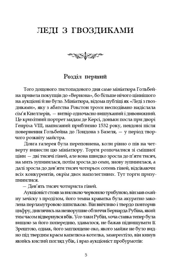 Головна героїня роману «Леді з гвоздиками» Кетрін Лорімер – успішна і багата жінка, власниця антикварного магазину. Вона опікується своєю племінницею Ненсі, яка прагне за будь-яку ціну стати великою актрисою. Кетрін і Ненсі несподівано виявляють, що закохані в одного чоловіка. Про подальший розвиток подій і всі перипетії з мініатюрою Гольбейна майстерно описано в романі.