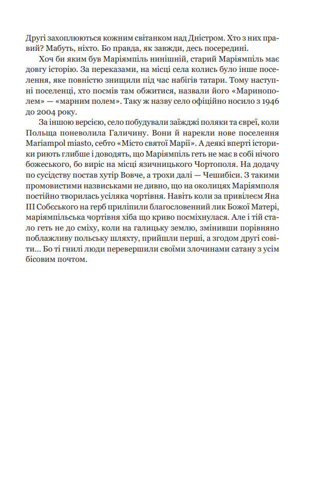 У книзі зображено село Маріямпіль (нині Івано-Франківщина) в період приходу других совітів, коли проти зайд боролася до останнього воїна боївка провідника УПА Сапера. Якщо певні події твору вас нажахають, то знайте: якраз вони — не авторська вигадка.