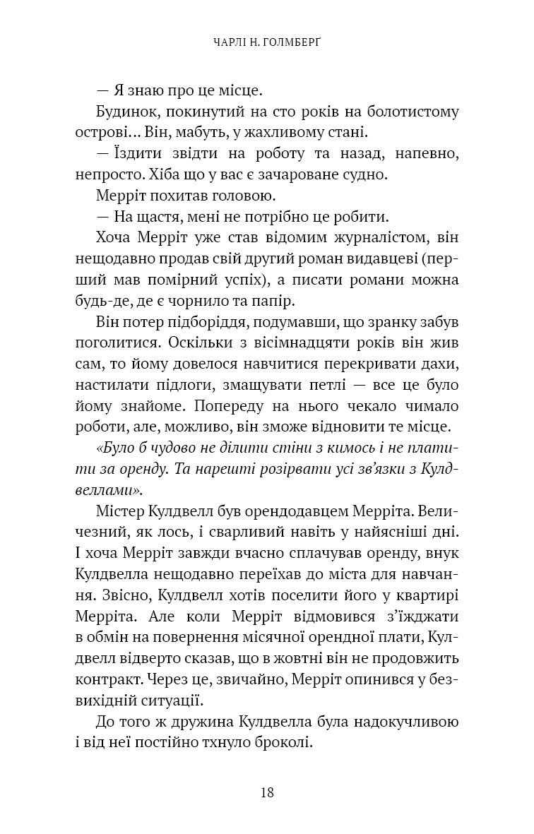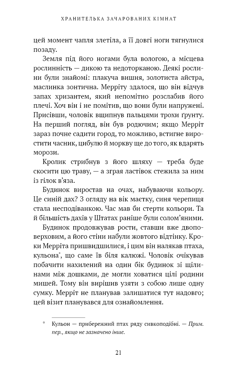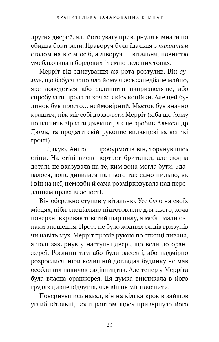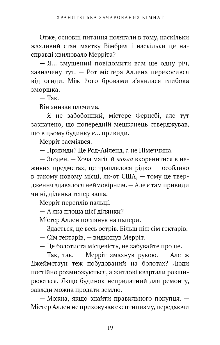 Мерріт Фернсбі хотів лише тихого притулку для письменництва. Натомість він отримує у спадок маєток Вімбрел на безлюдному острові — і стає його в’язнем. Двері замикаються. Стіни оживають. Втеча неможлива. На допомогу приходить Гульда Ларкін — фахівчиня з приборкання та утримання зачарованих кімнат і будівель. Вона знає, як домовитися з примхливими стінами та вередливими дверима. Але маєток Вімбрел інакший. Таємниці сягають глибше, ніж здається. А щось темне вже йде по їхній душу — і воно небезпечніше за будь-які чари всередині.