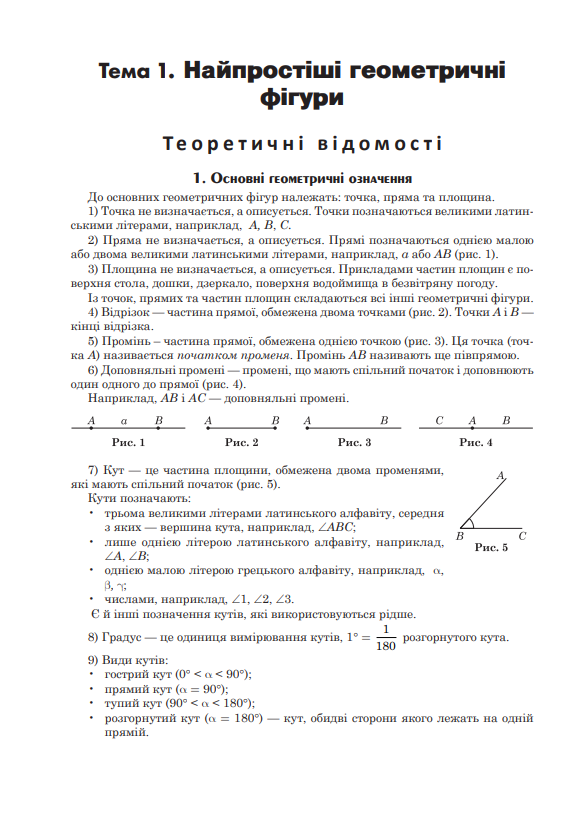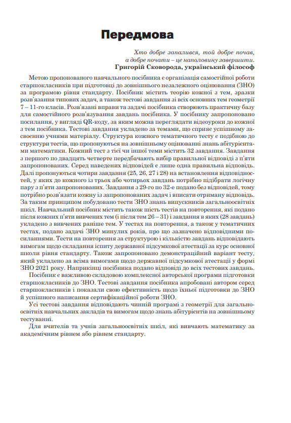 Випускники закладів освіти, які здобувають повну загальну середню освіту, обов’язково складають державну підсумкову атестацію (ДПА) у формі зовнішнього незалежного оцінювання (ЗНО) з математики. Здобувачі освіти, яким результат ЗНО з математики має зараховуватися як оцінка за ДПА, отримають її за результатами виконання завдань рівня стандарту, якщо вивчали математику на рівні стандарту, або рівня стандарту та профільного рівня, якщо вивчали математику на профільному рівні. Метою пропонованого навчального посібника є організація самостійної роботи учнів при підготовці до ЗНО за програмою рівня стандарту. У посібнику викладена теорія зі всіх основних тем шкільного курсу геометрії, запропоновано розв’язання низки задач, що роз’яснюють теорію. До кожної теми укладено тематичний тест за типологією тесту ЗНО. Після кожної групи тем подано тест на повторення вивченого матеріалу, який укладено подібно до тесту ЗНО рівня стандарту. До всіх завдань тестів є відповіді. При вивченні теорії тієї чи іншої теми можна переглядати відеуроки, на які наведено посилання. Усі тестові завдання відповідають чинній програмі з геометрії для закладів загальної середньої освіта рівня стандарту та вимогам щодо написання сертифікаційної роботи ЗНО. Для вчителів та учнів закладів загальної середньої освіти, які вивчають математику на рівні стандарту.