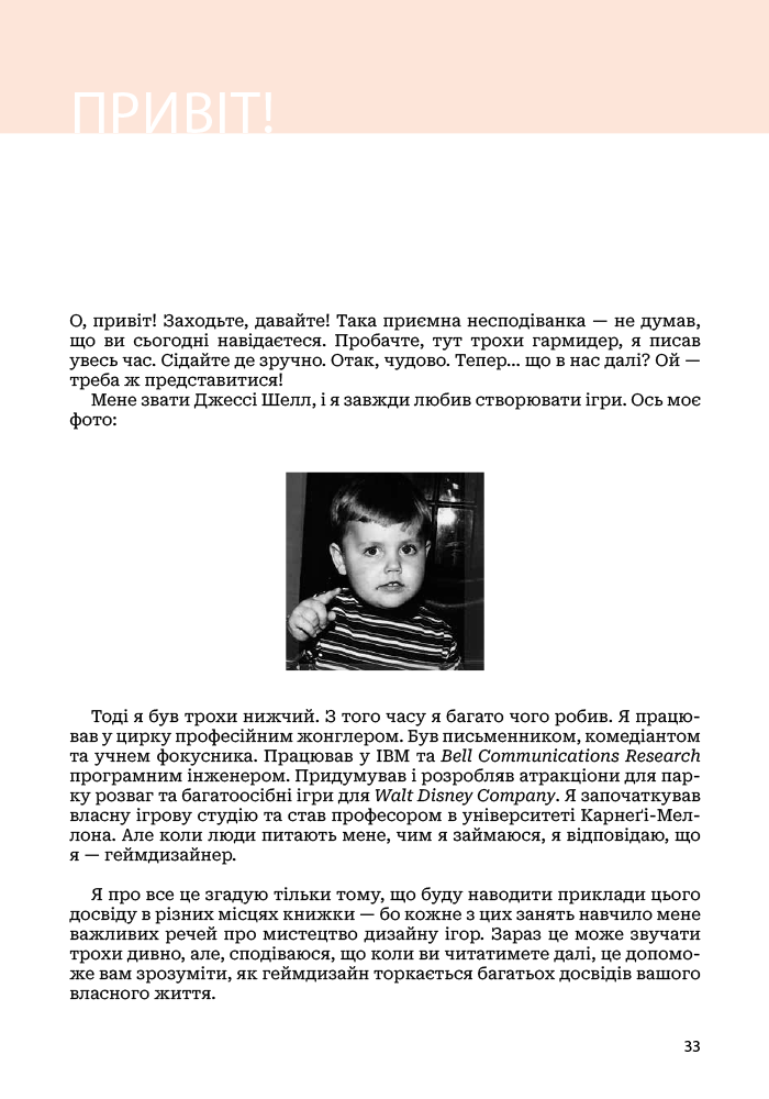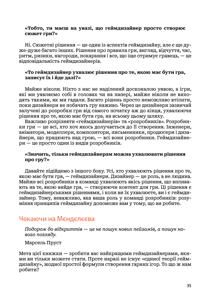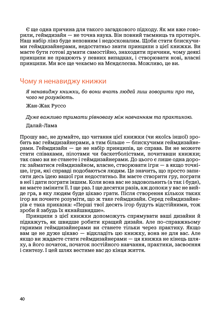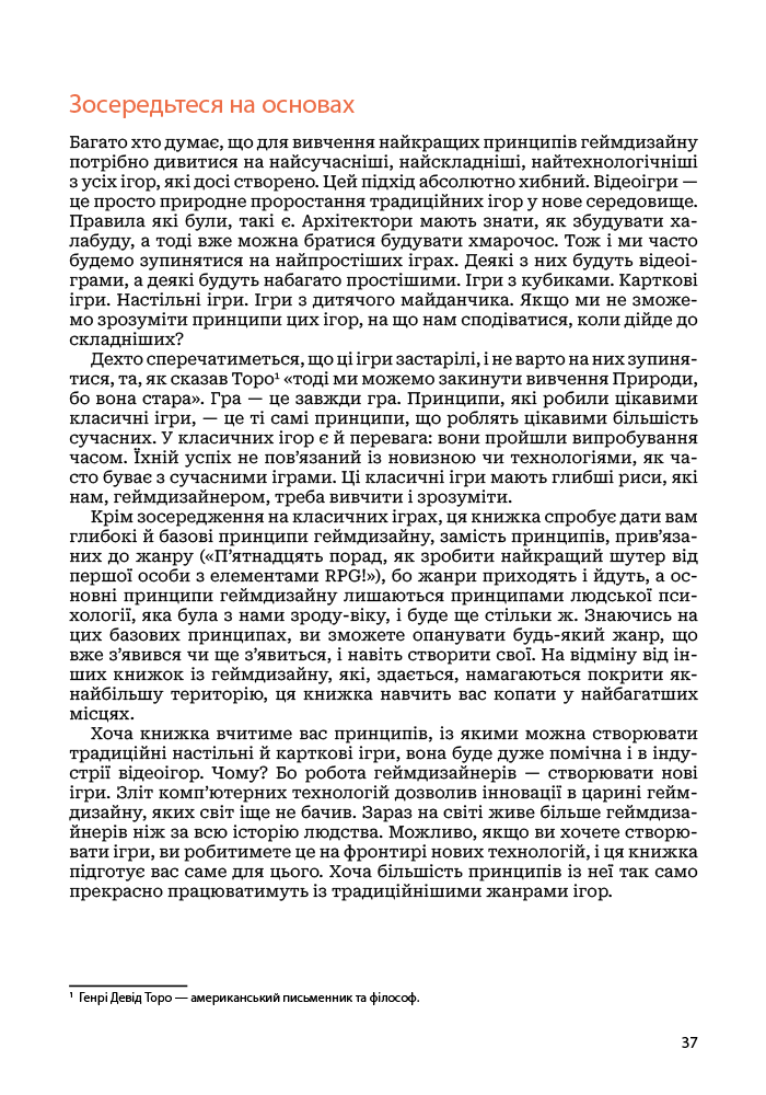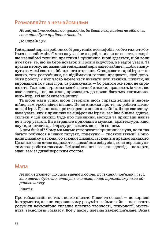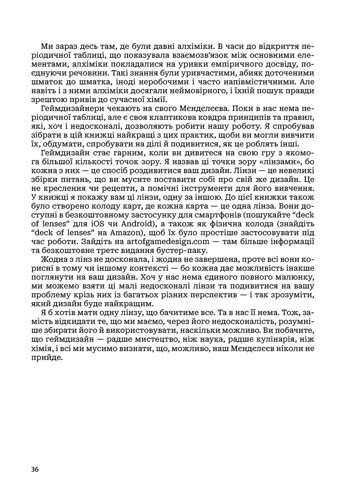 Хороший геймдизайн — це коли ви вмієте поглянути на свою гру з якомога більшої кількості точок зору. «Мистецтво геймдизайну», книжка одного з найкращих світових геймдизайнерів Джессі Шелла, пропонує 116 наборів запитань, або лінз для розгляду дизайну гри, що охоплюють різні сфери — психологія, архітектура, музика, візуальний дизайн, кіно, програмна інженерія, дизайн тематичних парків, математика, дизайн головоломок і антропологія. Завдяки цій книжці ви навчитеся швидше і краще втілювати ігрові проєкти. Крім глибокого розуміння теорії, вона забезпечить вас детальними практичними інструкціями, що допоможуть вам створювати ігри світового класу, в які люди хотітимуть грати знову і знову.