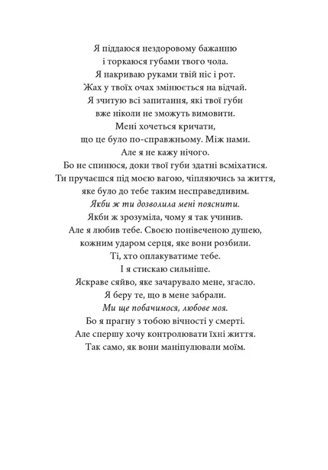 Чи переживе їхнє кохання правду, яка нарешті вирвалася просто неба й простяглася перед їхніми очами, зневажена і зболена? Чи покине їх колись ця провина? Чи пробачать вони самі собі?