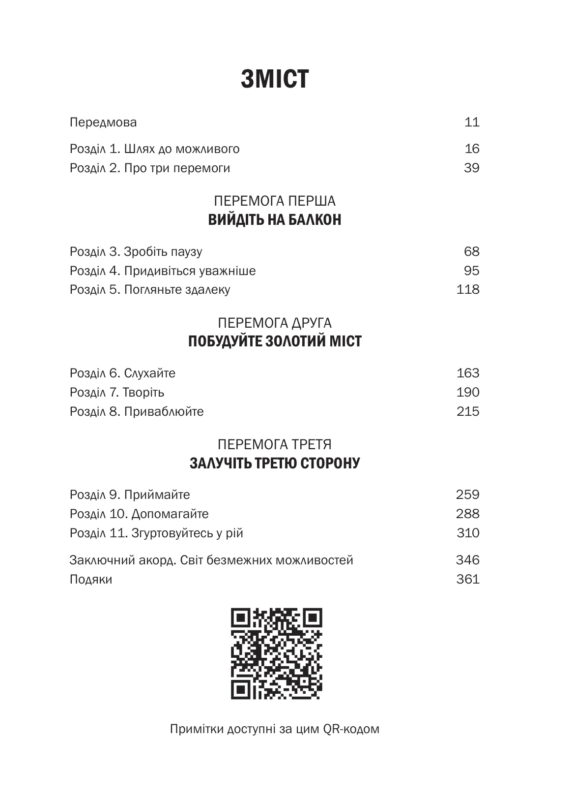 Автор ділиться численними історіями з власної практики, що спонукають поглянути на конфлікти — від сімейних до міждержавних — по-новому, і додає: протистоянь не уникнути, але ми можемо перетворити їх на джерело нашого зростання.