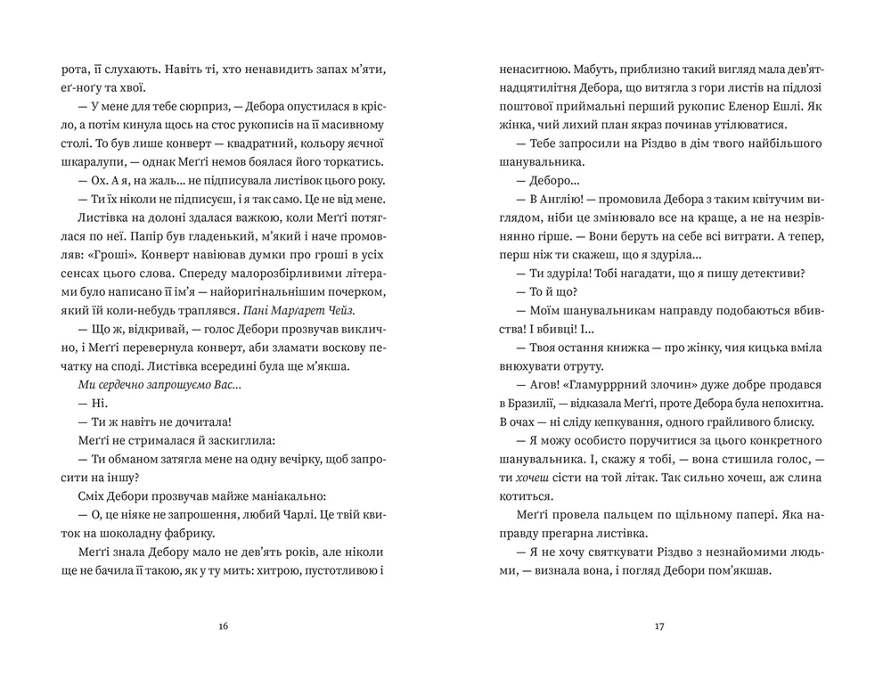Меґґі та Ітан, здається, не надто люблять одне одного, але вони обоє отримують загадкове запрошення на різдвяну вечірку. Отож напередодні Різдва Меґґі з Ітаном опиняються в англійському маєтку на відлюдді, куди разом з іншими письменниками їх запросила Еленор Ешлі, всесвітньовідома авторка детективних романів. Але раптом Еленор зникає, а Ітан може бути чи не єдиною людиною, кому Меґґі може довіряти. Та, можливо, йдеться не лише про довіру, а про щось більше?