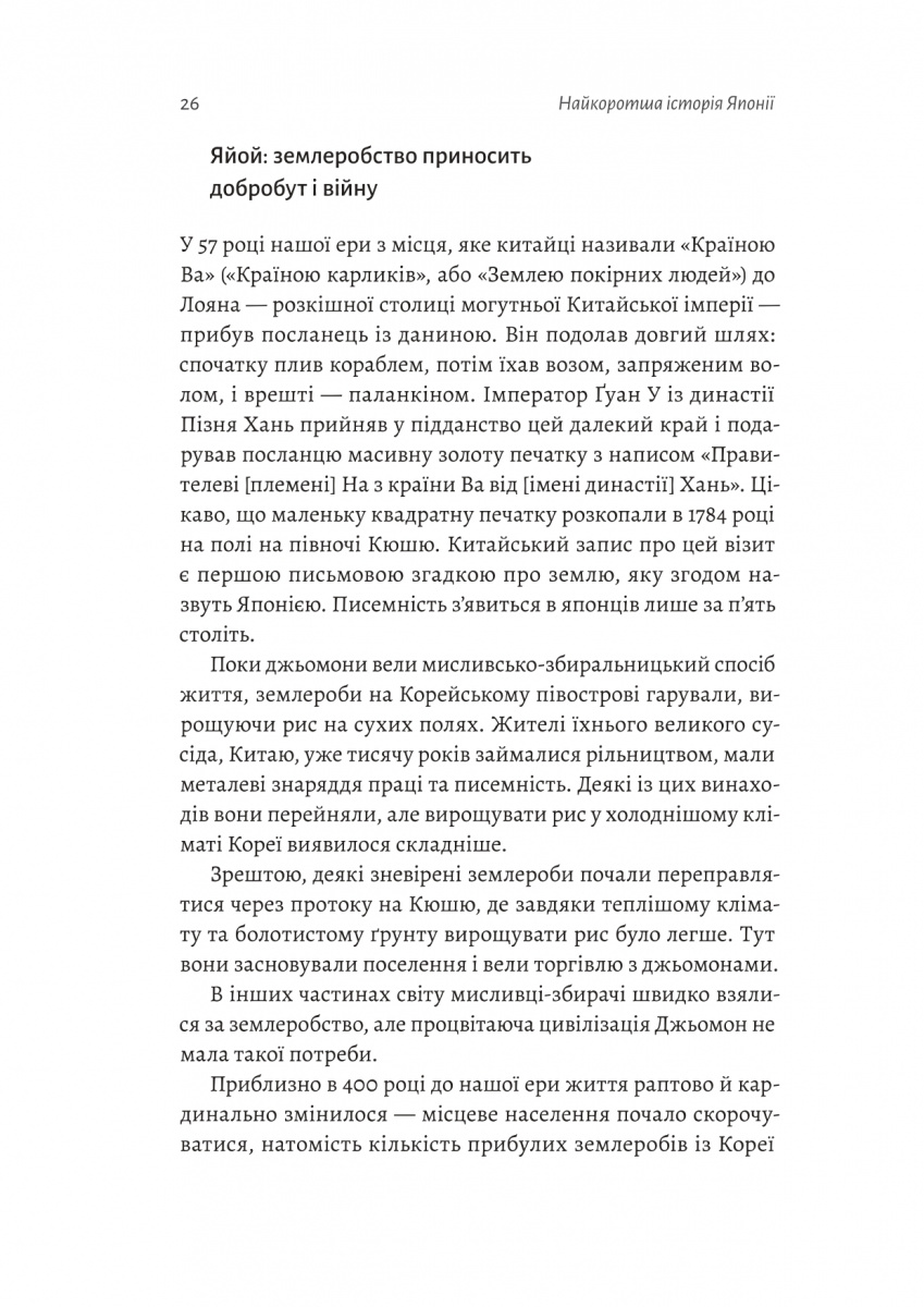 Чому культура Японії викликає захоплення? Що ховається за її стриманістю, естетикою і зовнішньою гармонією? І як Японія, уникаючи колонізації, зуміла зберегти свою ідентичність, а згодом — і завоювати світ? Британська історикиня Леслі Даунер занурює читачів у вир японської історії, повної драми, краси й парадоксів: від закритого періоду Едо до епохи гіпермодерну. На сторінках «Найкоротшої історії Японії» оживають імператори — нащадки богині Сонця, самураї і шьоґуни, придворні дами й жінки-воїни, купці та гейші — ті, хто формував культурне обличчя Японії впродовж століть. Це новий крок у світ, де манґа і меч, дзен і бізнес, традиції і технології співіснують у досконалій рівновазі.