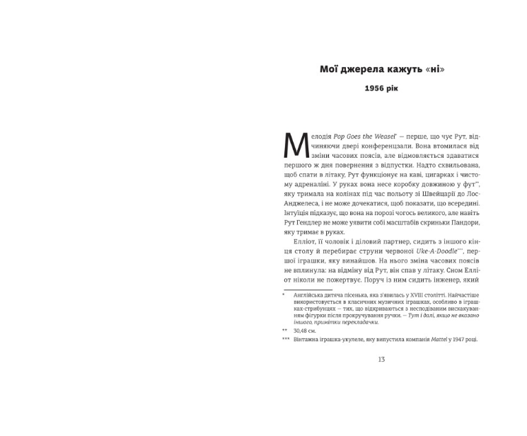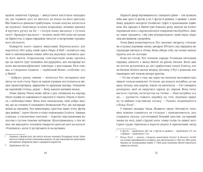Її зріст — лише 29 сантиметрів, але вона змінила світ. Перед вами історія, заснована на реальних подіях, про те, як була створена улюблена іграшка багатьох поколінь. Авторка ідеї Рут Гендлер зробила крок у невідомість і випередила свій час, надихнувши мільйони дівчат мріяти про те, що вони можуть стати ким захочуть — від геніальних винахідниць до сміливих космонавток. В історії Барбі було чимало злетів і падінь, але ніхто не стане сперечатися з тим, що це не просто лялька, а справжня легенда. Ця книга не тільки про іграшку. За шаленим успіхом Барбі прихована мозаїка неймовірно напружених днів і місяців, протягом яких уся креативна команда Mattel буквально жила думками про своє творіння. Навколо Барбі розгортаються надії і розчарування, публічні скандали й особисті драми. Книга яскраво демонструє нам залаштунки великих компаній, а також ціну, яку доведеться заплатити за успіх.