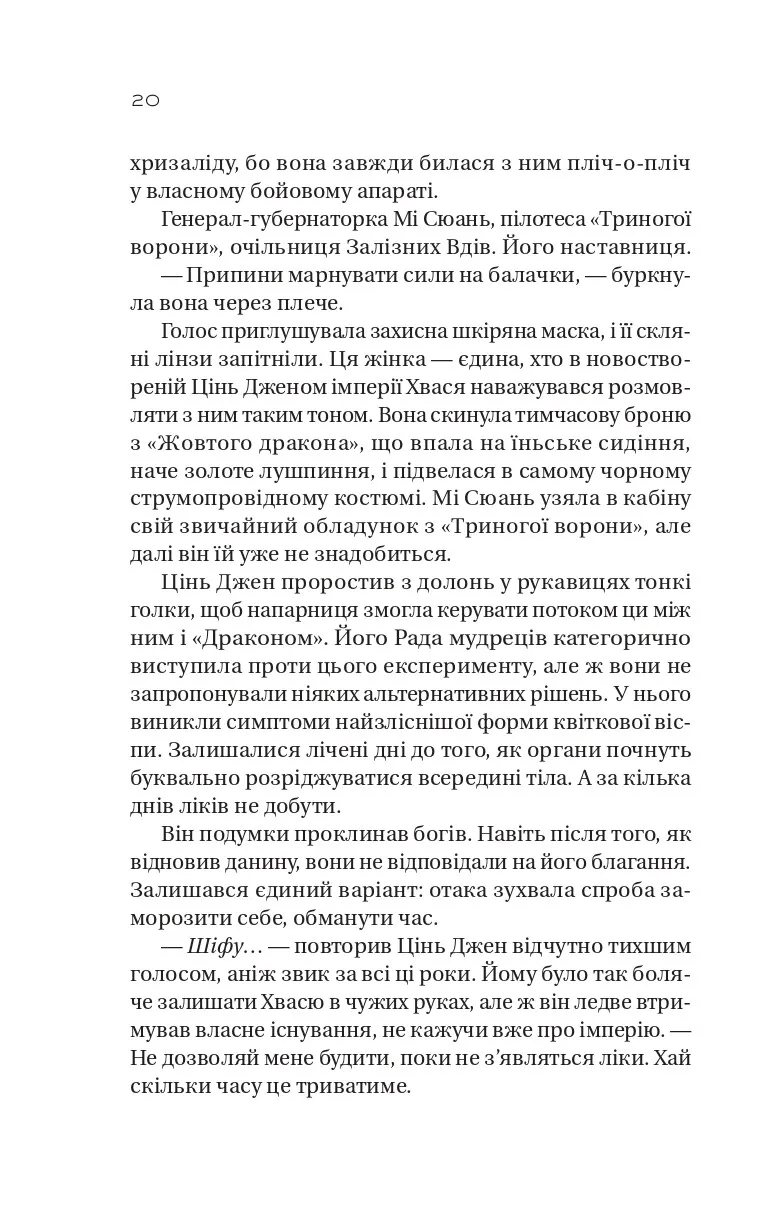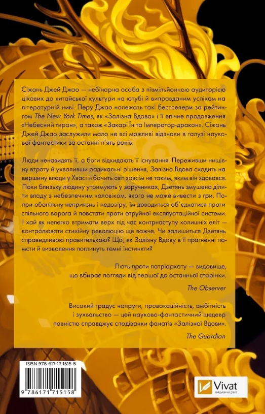Люди ненавидять її, а боги відкидають її існування. Переживши нищівну втрату й ухваливши радикальні рішення, Залізна Вдова сходить на вершину влади у Хвасі й бачить світ зовсім не таким, яким він здавався. Поки близьку людину утримують у заручниках, Дзетянь змушена ділити владу з небезпечним чоловіком, якого не може вивести з гри. Попри обопільну неприязнь і недовіру, їм доводиться об’єднатися проти спільного ворога й повстати проти отруйної експлуатаційної системи. І хай як нелегко втримати верх під час контрнаступу колишніх еліт — контролювати стихійну революцію ще важче. Чи залишиться Дзетянь справедливою правителькою? Що, як Залізну Вдову в її прагненні помсти й визволення поглинуть темні інстинкти?