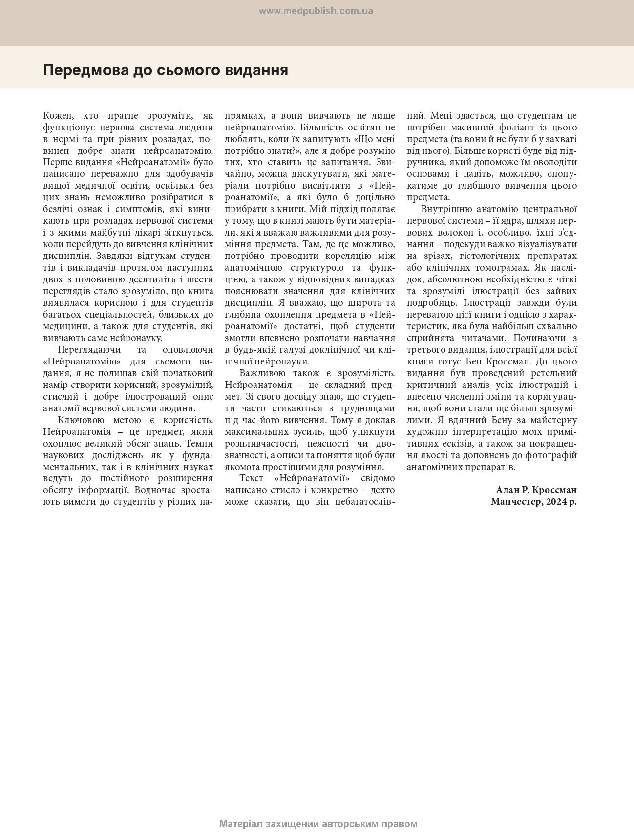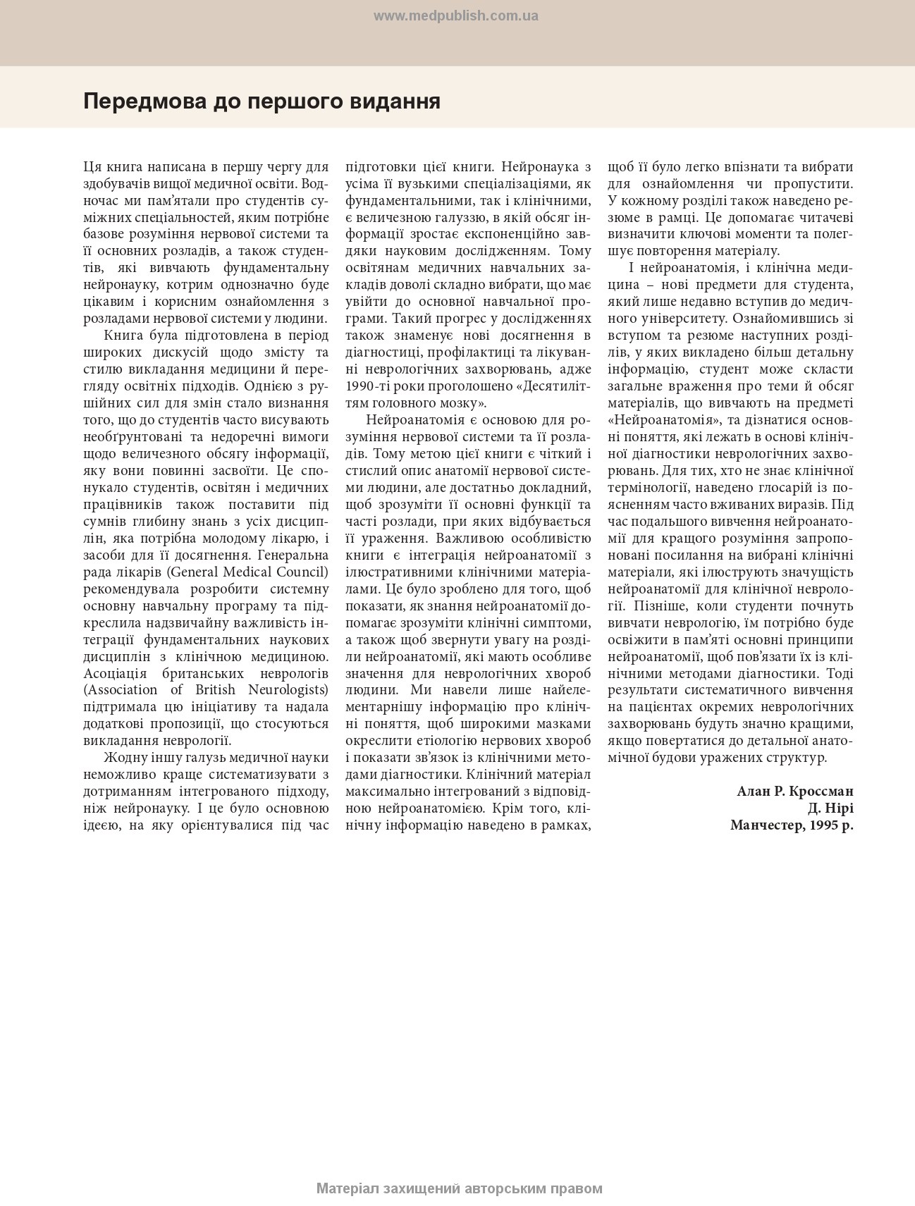 Автору вдалося так викласти матеріал, щоб з одного боку надати стислий огляд, а з іншого — не втратити цілісності висвітлення предмета, притаманної фундаментальним виданням. У цій книзі чітко викладені принципи нейроанатомії. У ній наведено опис нормальної будови та функції анатомічних структур, пояснено клінічно значущі порушення, які виникають при станах, з якими студенти стикатимуться в клінічній практиці.