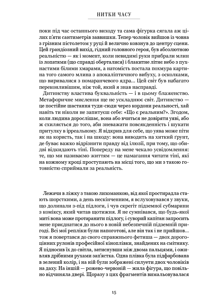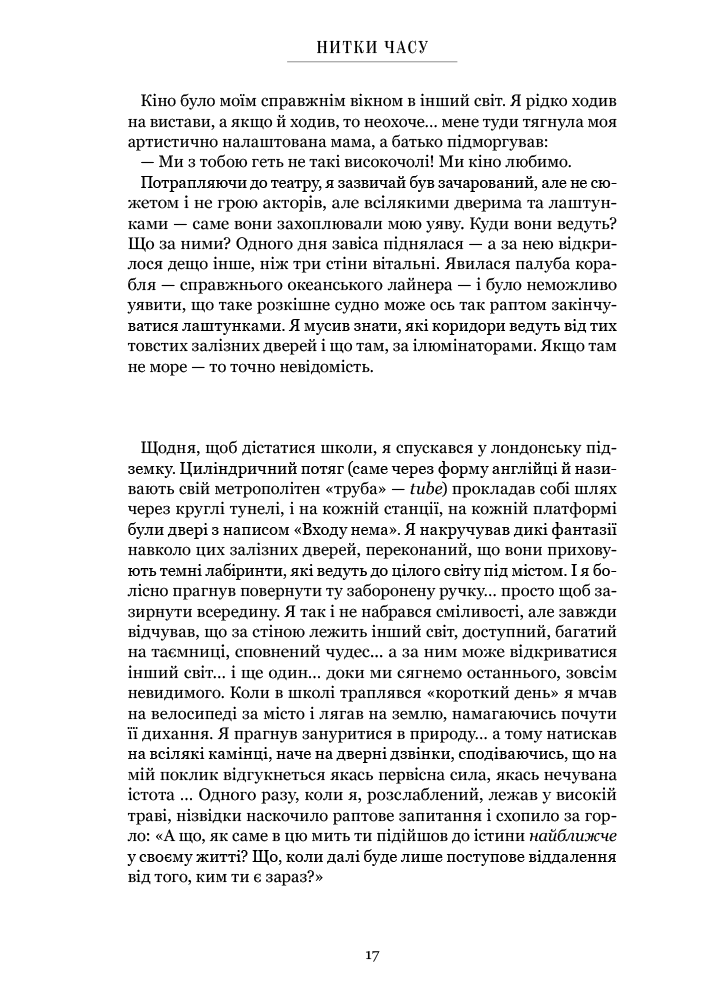 “Нитки часу” - автобіографія легендарного режисера Пітера Брука, одного з найвпливовіших митців сучасного театру. У своїх спогадах Брук ділиться історією творчих пошуків, філософських відкриттів і особистих зустрічей, що сформували його мистецький шлях. Це відверта розповідь людини, що пройшла шлях від класичних постановок до радикальних інновацій. Режисер Пітер Брук розкриває безліч джерел, що живили його довічну пристрасть до пошуків найвиразнішого способу розповісти історію. Він також описує свої подорожі в Афганістан, Африку та Індію, пошуки нових способів виразності, дослідження універсальної театральної мови. Це тепла і натхнення розповідь, яка дозволяє зазирнути у внутрішній світ видатного майстра.