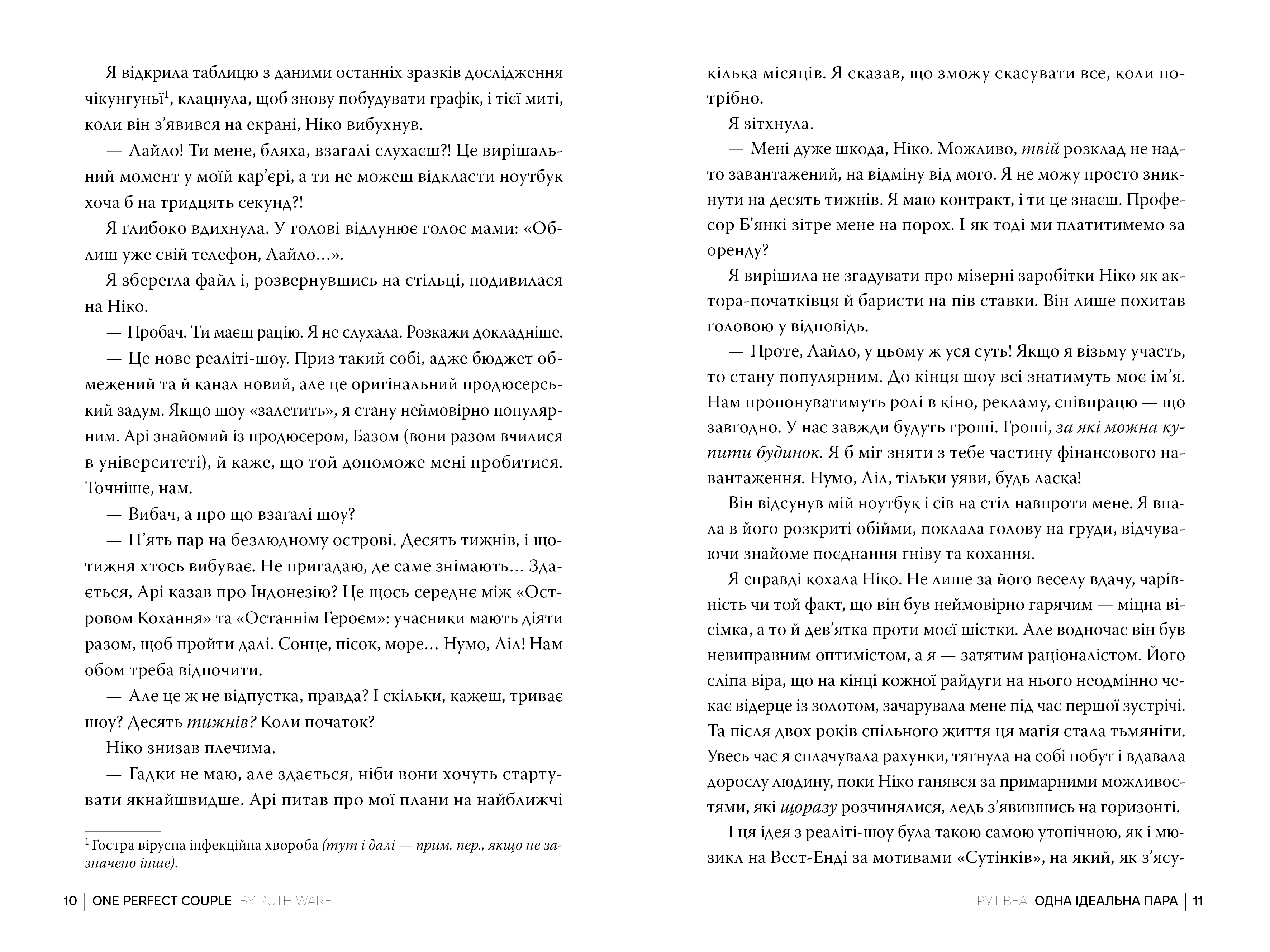 «Одна ідеальна пара» — динамічний і напружений трилер, сповнений інтриг та переконливих персонажів. Цей роман ще раз доводить, що Рут Веа — королева психологічного саспенсу.