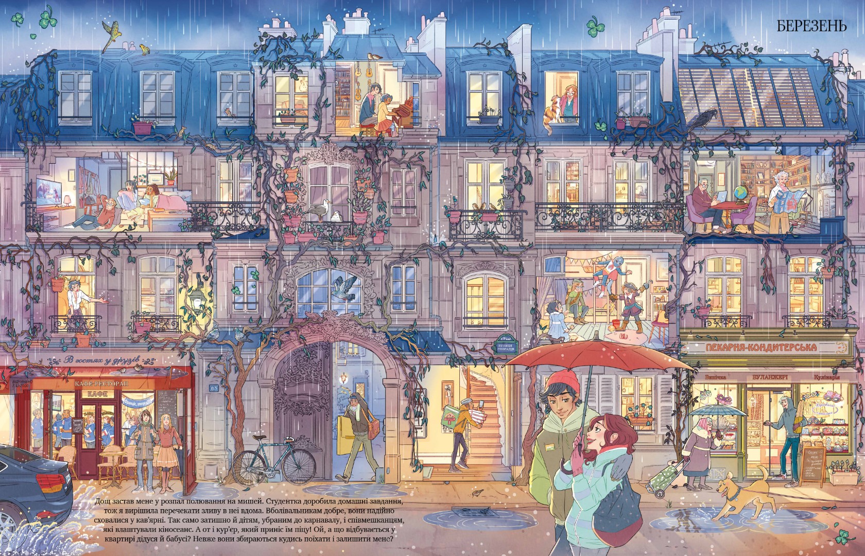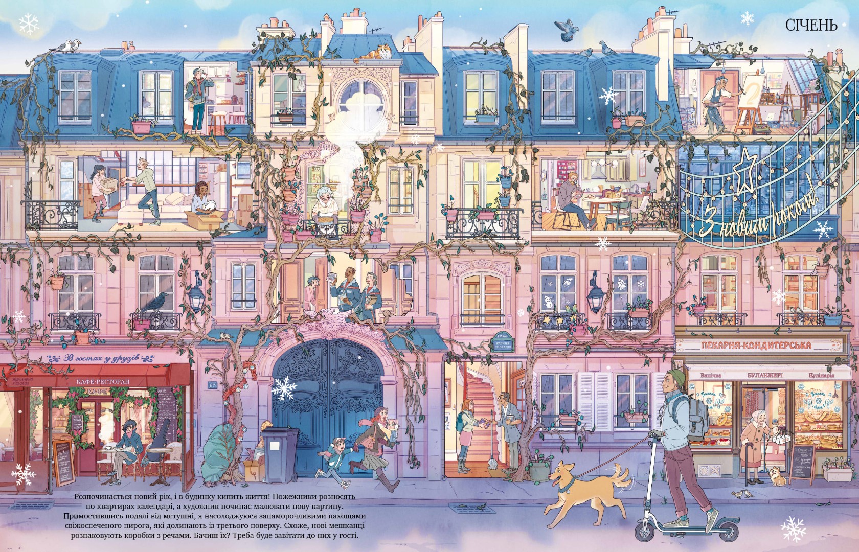 Чудова книга з дванадцятьма ілюстраціями, наповненими деталями, які можна довго розглядати, домальовувати в уяві — і розповідати історії про життя мешканців будинку протягом цілого року.