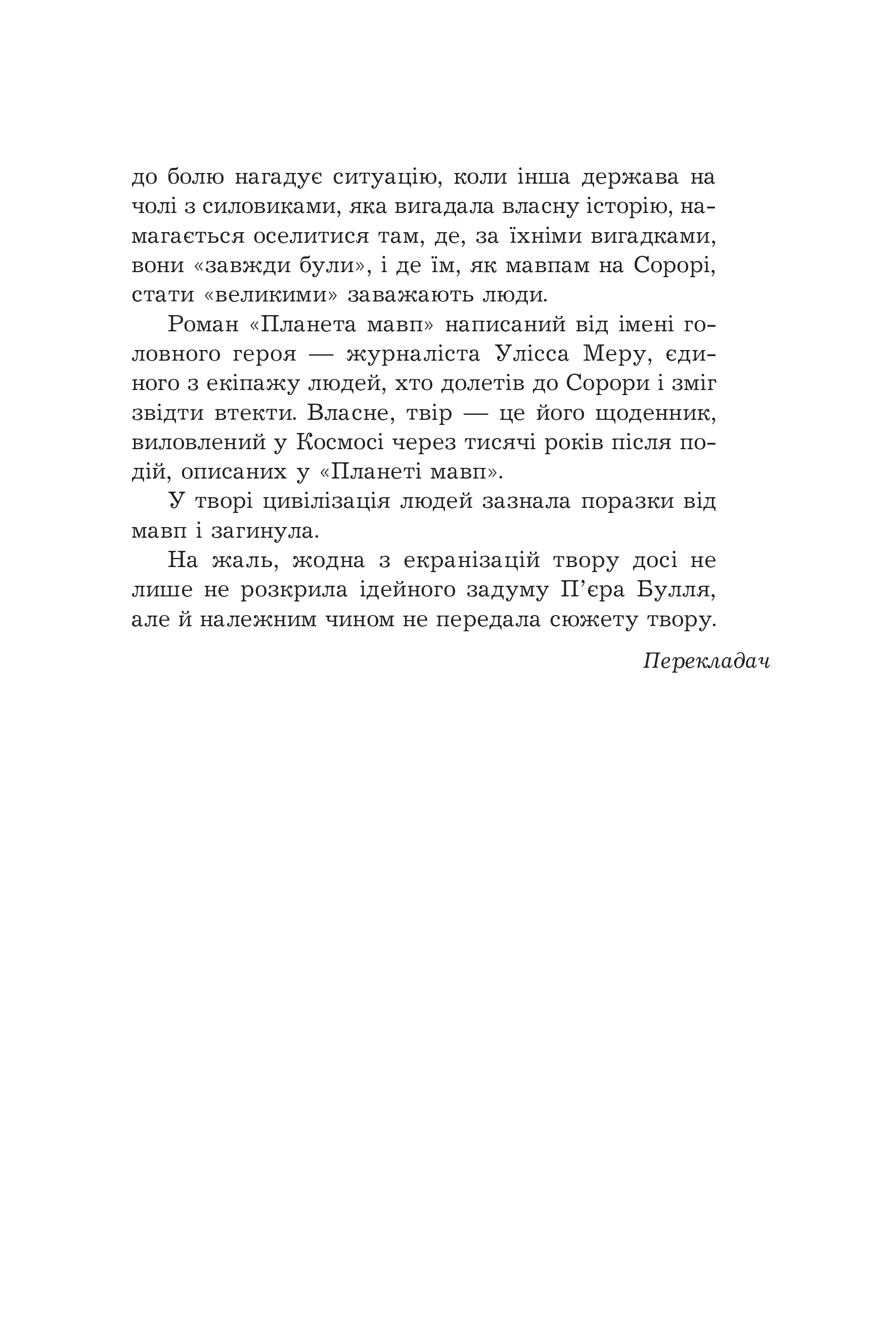 «Планета мавп» — науково-фантастичний роман французького письменника П’єра Булля, написаний у формі щоденника. Його головний герой — журналіст Улісс Меру, який у складі космічної експедиції потрапляє на планету, де правлять розумні мавпи, а люди, тупі тварини, не зуміли піднятися вище по еволюційних щаблях. Сповнена їдкої іронії, ця книжка була і зостається рефлексією на тему соціальних змін і вічного циклу розвою і занепаду великих цивілізацій.