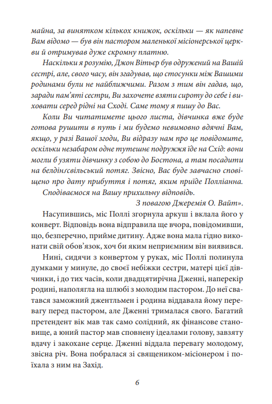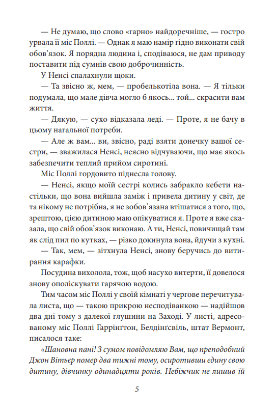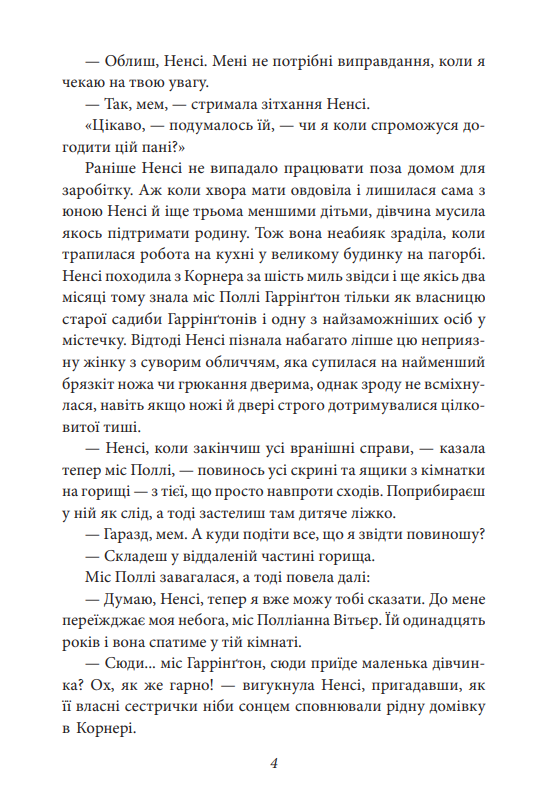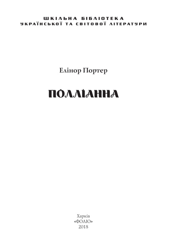 Бестселер Елінор Портер (1868–1920) «Полліанна» – це добра історія про дивовижну дівчинку, що після смерті батьків потрапила на виховання до своєї суворої тітки. Володіючи вражаючою здатністю завжди і всюди, незважаючи на найгірші обставини, «грати в радість», робити це щиро і щедро, Полліанна зуміла вилікувати від нудьги, болю і похмурості всіх, хто з нею зустрівся.