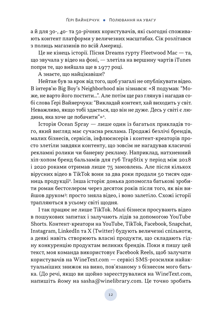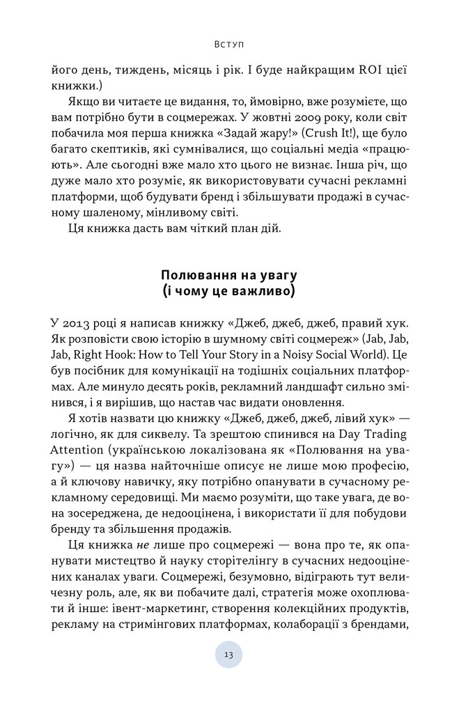 Автор розбирає десятки кейсів: як співпрацювати з інфлюєнсерами, генерувати контент для будь-яких ніш, перетворювати простий товар на предмет класу люкс чи застосовувати соцмережі у виборчих кампаніях. Вайнерчук також розповідає, як «тіктокізація» змінює правила гри, згадує, як ШІ вже формує нову систему маркетингу і чому персоналізовані бренди можуть витіснити корпорації в найближчі 10–15 років.