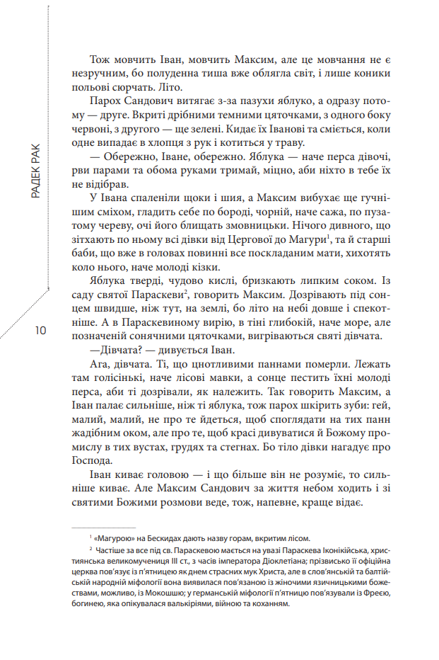 Радек Рак у своїх інтерв’ю часто говорить про себе як про нащадка польських селян-кріпаків. Ця подвійна оптика – міського жителя, який засвоїв культурні та літературні канони сучасного світу, та людини, яка намагається не забувати свого коріння, – накладає відбиток на більшість авторських творів. А відтак з’являються химерно переплетені сюжети, де персонажі народної демонології та (квазі)історичні герої зіштовхуються у вирі місць та міст, занурюються в польське повсякдення останніх трьох століть, – та ще й так майстерно переплетені, що часом і не відділити міф від реальності.