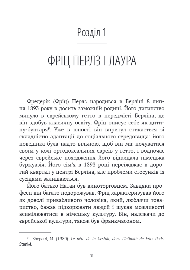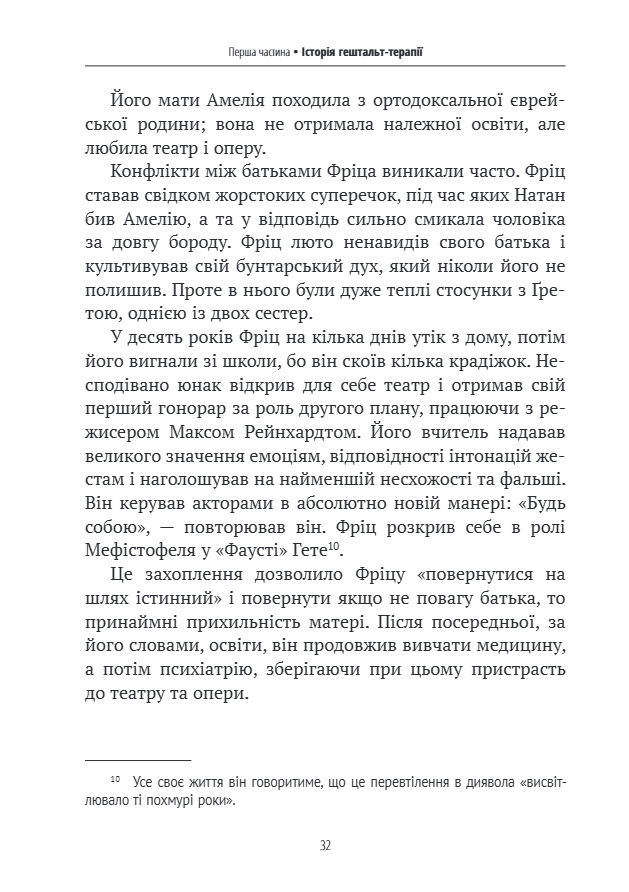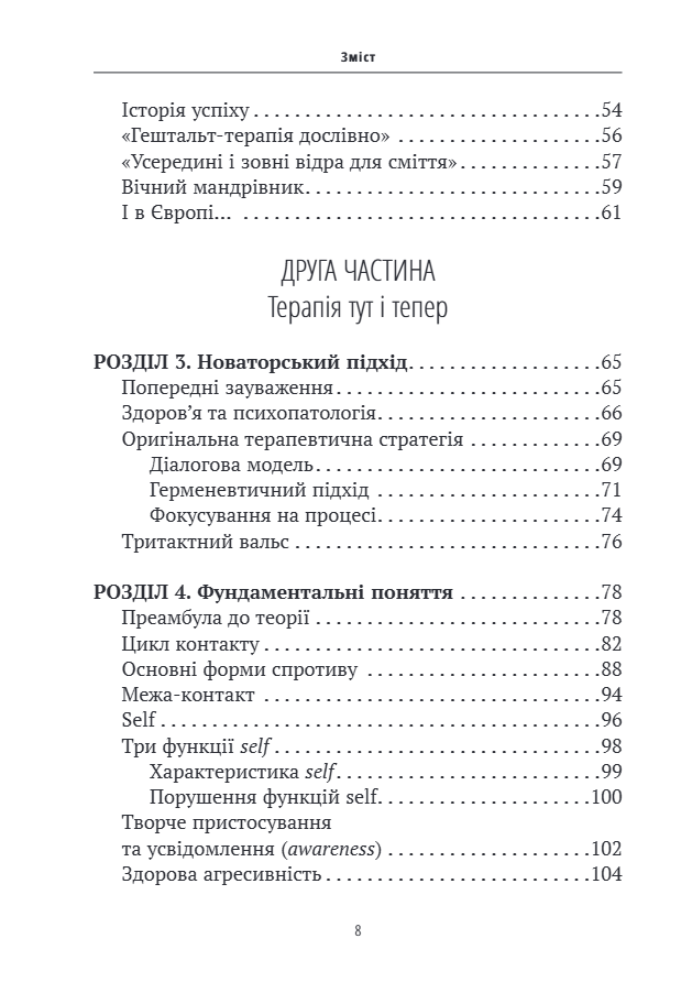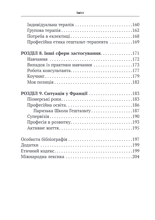 Нарешті, автор розглядає сучасні сфери застосування гештальт-підходу: не тільки індивідуальну або групову психотерапію, але й роботу в організаціях, правліннях компаній та професійну підготовку. Він надає погляд на синтез різних аспектів цієї важливої перспективи в сучасній психології.