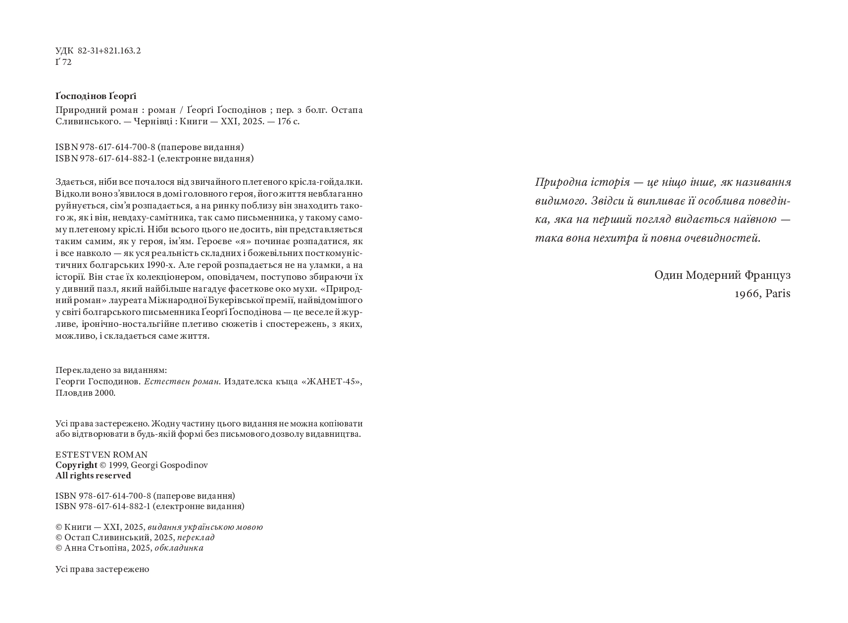 Здається, ніби все почалося від звичайного плетеного крісла-гойдалки. Відколи воно з’явилося в домі головного героя, його життя невблаганно руйнується, сім’я розпадається, а на ринку поблизу він знаходить такого ж, як і він, невдаху-самітника, так само письменника, у такому самому плетеному кріслі. Ніби всього цього не досить, він представляється таким самим, як у героя, ім’ям. Героєве «я» починає розпадатися, як і все навколо — як уся реальність складних і божевільних посткомуністичних болгарських 1990-х. Але герой розпадається не на уламки, а на історії. Він стає їх колекціонером, оповідачем, поступово збираючи їх у дивний пазл, який найбільше нагадує фасеткове око мухи. «Природний роман» лауреата Міжнародної Букерівської премії, найвідомішого у світі болгарського письменника Ґеорґі Ґосподінова — це веселе й журливе, іронічно-ностальгійне плетиво сюжетів і спостережень, з яких, можливо, і складається саме життя.